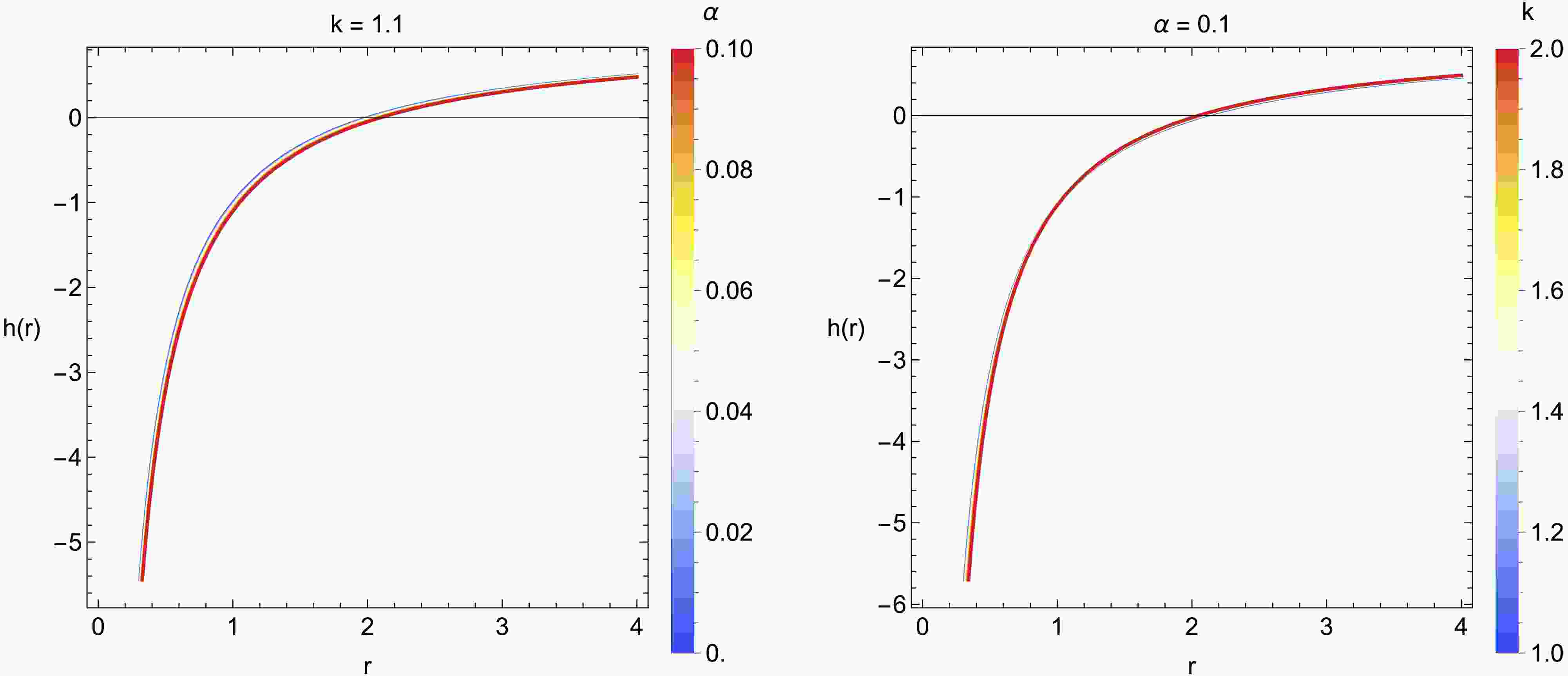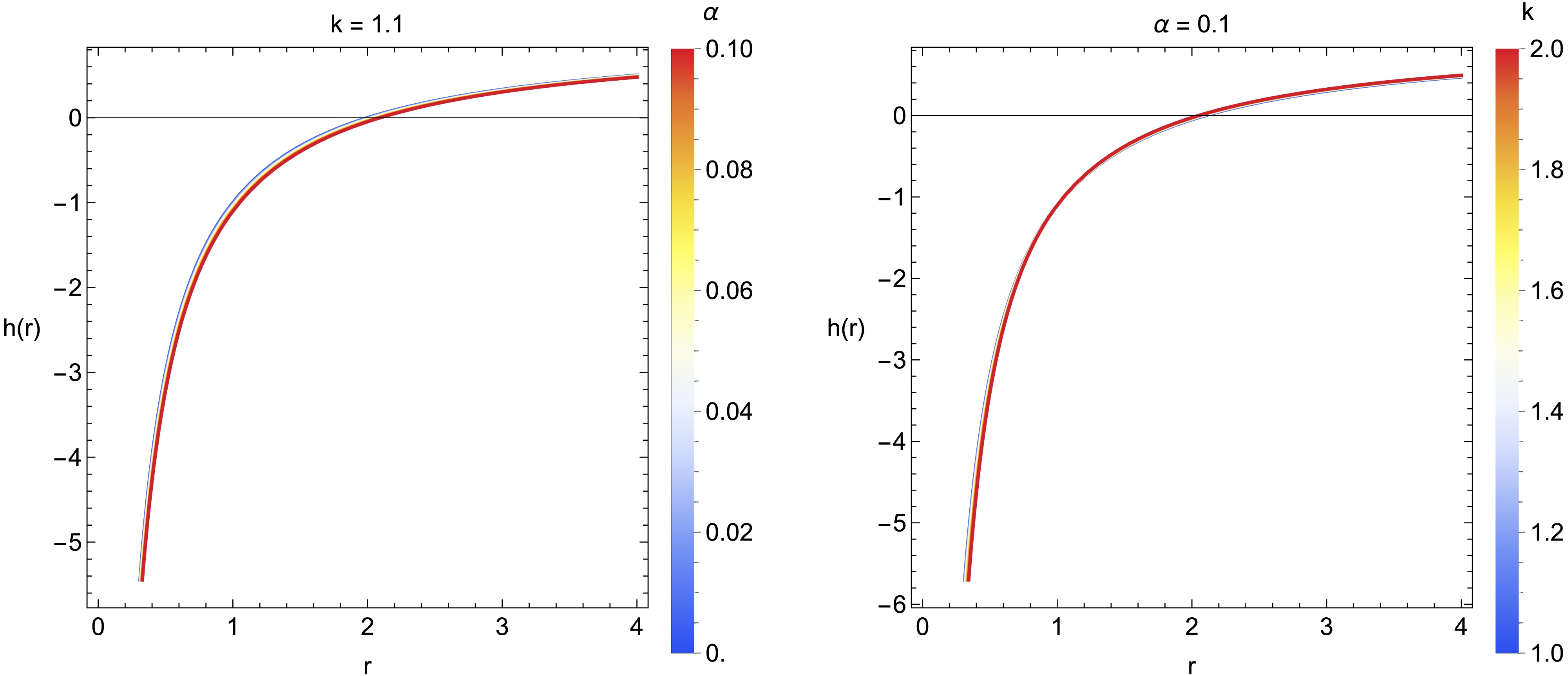 $ h(r) $ is illustrated in Fig. (1). The value of$ h(r) $ is observed to increase as α or k increases, illustrating that both parameters contribute positively to the growth of the lapse function.