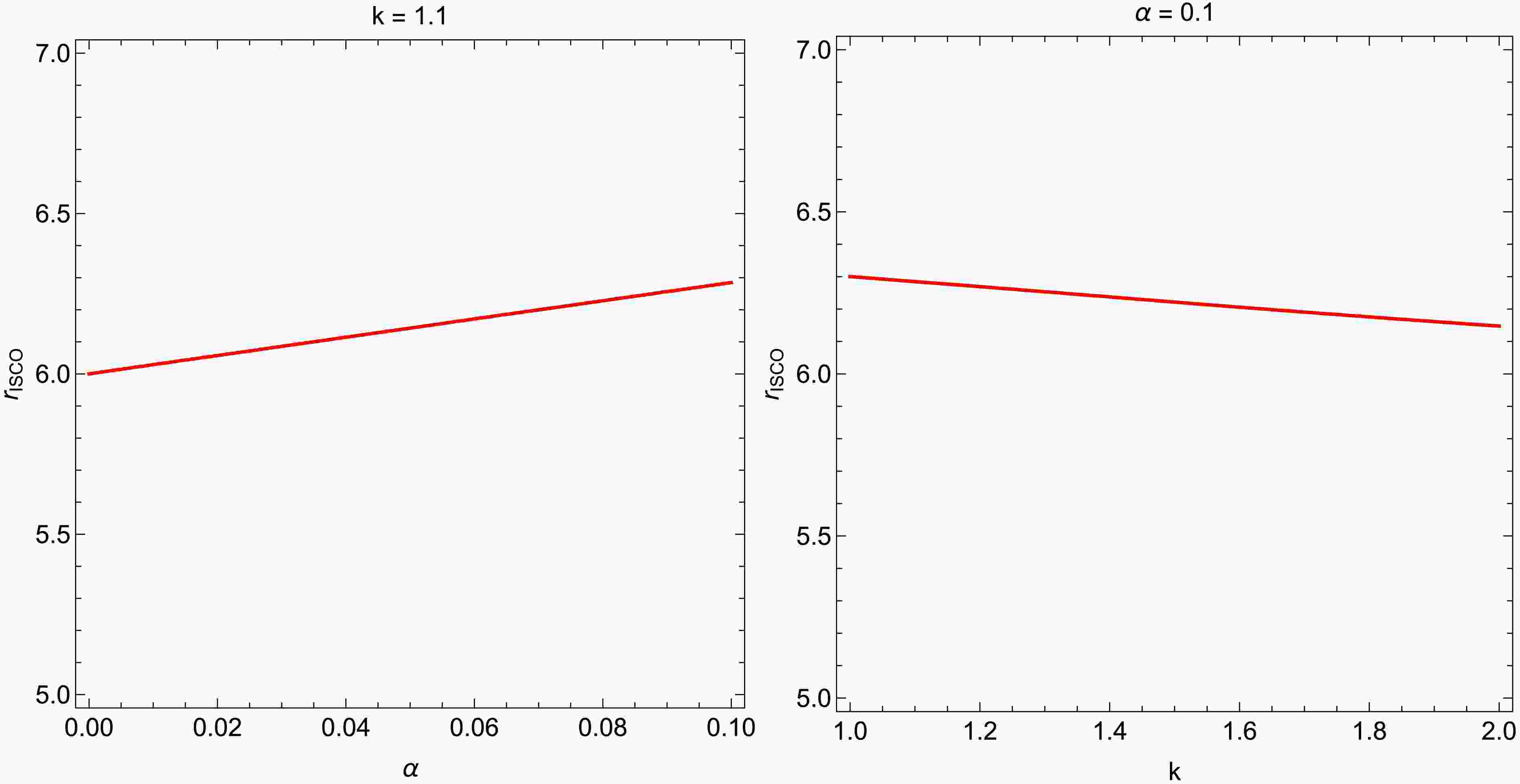 $ {{\cal{L}}} $ increases with α but decreases with k, while$ {{\cal{E}}} $ shows non-monotonic dependence on α.● The ISCO radius grows with α and shrinks with k, deviating from the fixed Schwarzschild value