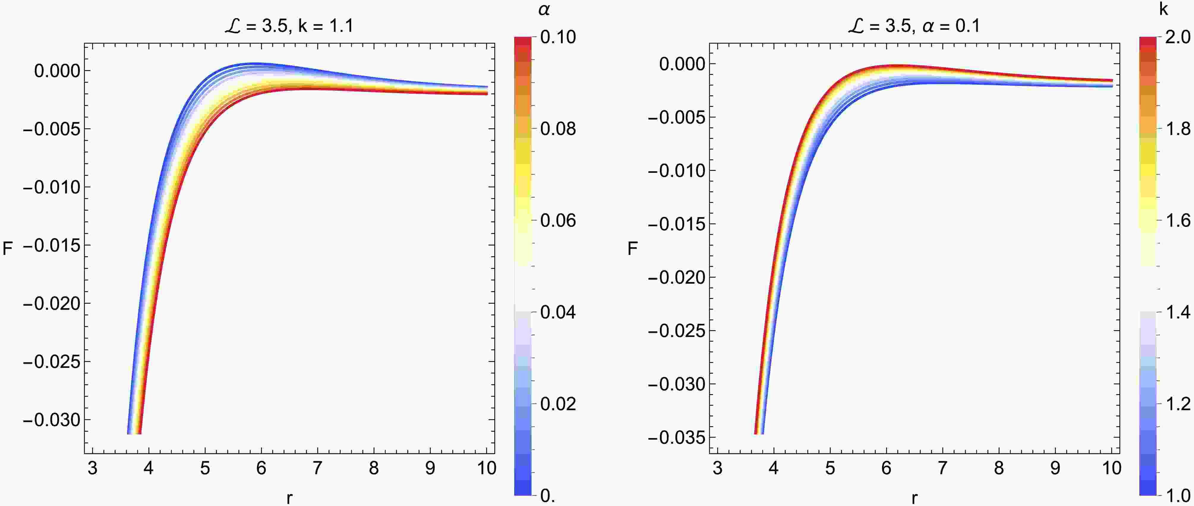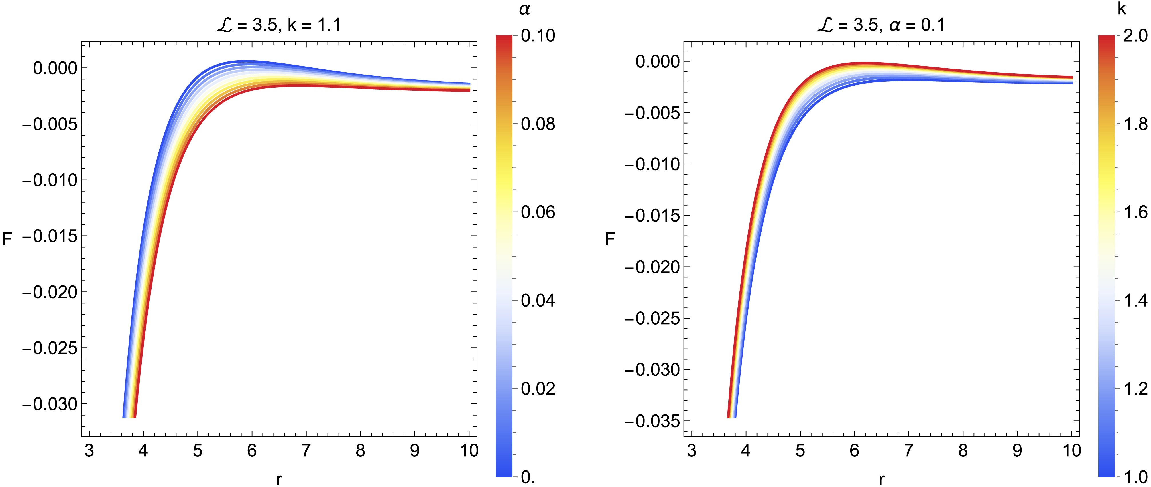 $ {\cal{L}} = 3.5 $ . (i) Left panel: Effective force for fixed$ k = 1.1 $ and varying$ \alpha = 0, 0.02, 0.04, 0.06, 0.08, 0.10 $ . (ii) Right panel: Effective force for fixed$ \alpha = 0.1 $ and different values of$ k = 1.0, 1.2, 1.4, 1.6, 1.8, 2.0 $ . Also, increasing α strengthens the attractive force, while larger k introduces repulsive features. -
