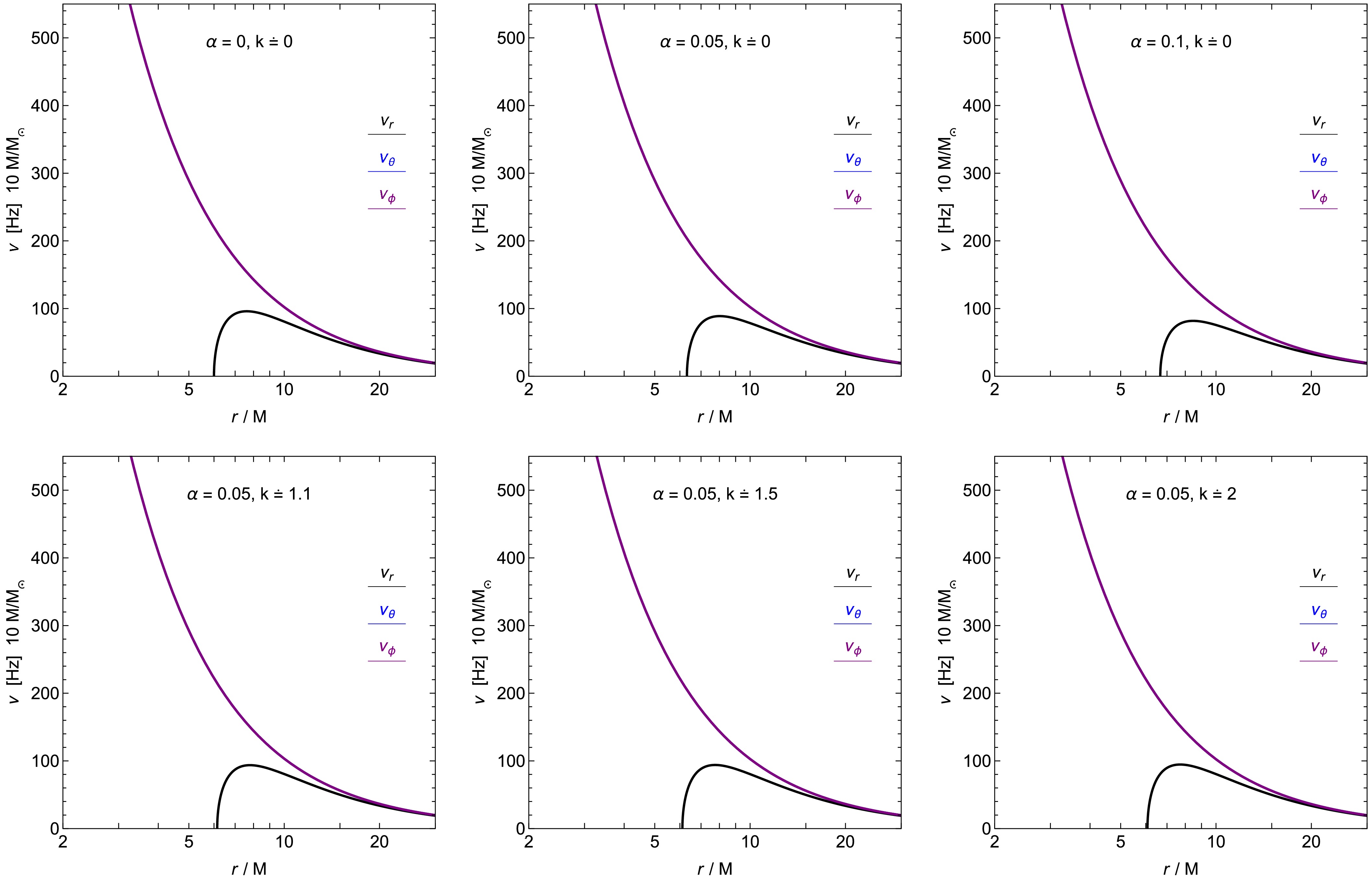$ \nu_i $ represents the physical frequencies measured by a distant observer, expressed in hertz (Hz), and the index$ i\in{r,\theta,\phi} $ labels the radial, polar, and azimuthal components, respectively. Here,$ \Omega_{r} $ ,$ \Omega_{\theta} $ , and$ \Omega_{\phi} $ stand for the dimensionless radial, polar, and azimuthal frequencies measured at infinity, given by$\begin{aligned}[b] \Omega_{r}^{2} =\;& - \frac{1}{\chi(r,\alpha,k)} [3^k (r-3)^2 (-2 \alpha \left(k^2-6 k-1\right) r^{k+1}\\&+\alpha (k-2) k r^{k+2}+12 r^{2 k}-2 r^{2 k+1}+\alpha ^2 k (k+2) r^2)] ,\end{aligned} $