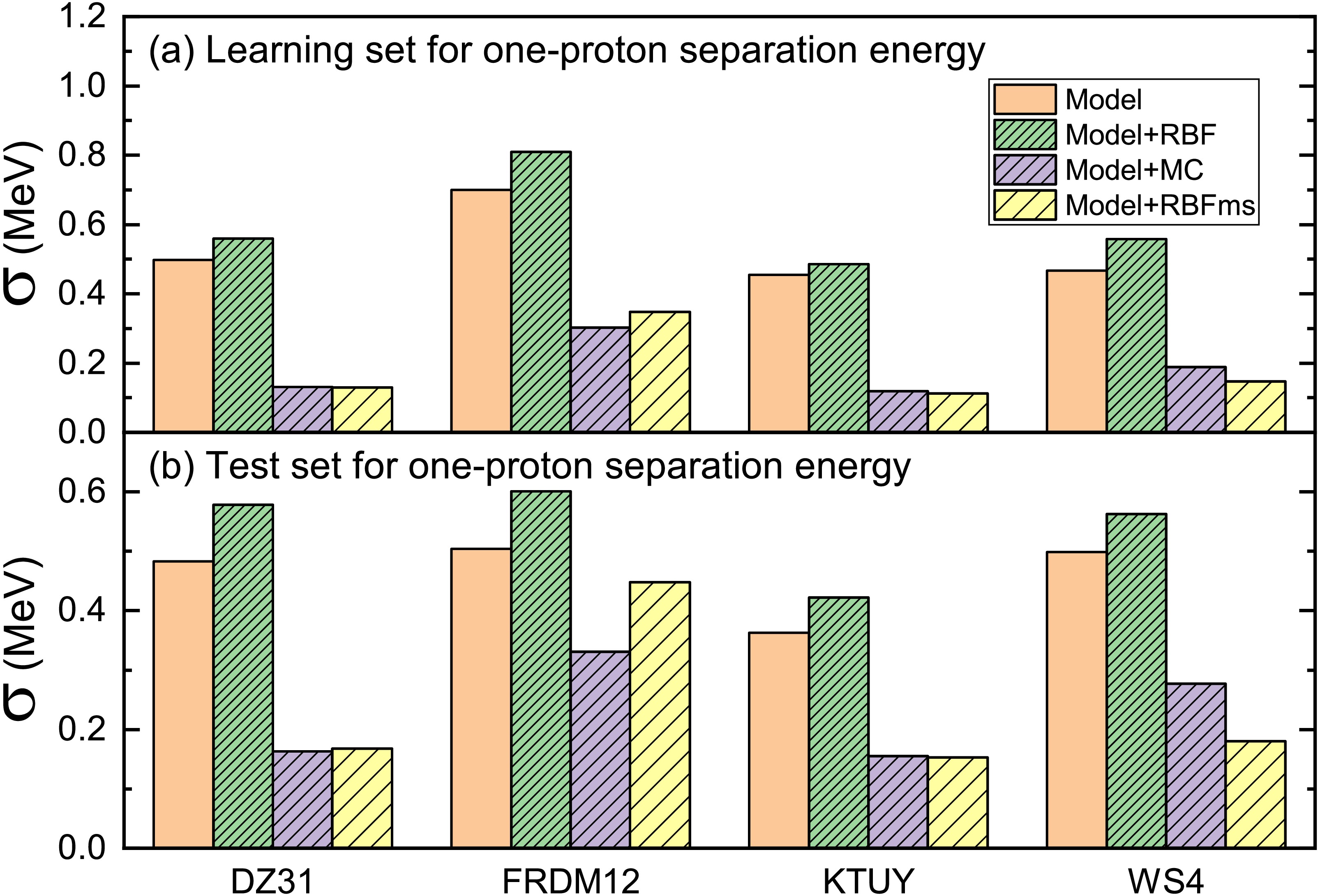 Figure 1. (color online) (a) Root-mean-square (rms) deviation of the learning set for one-proton separation energy obtained using four nuclear mass models (DZ31, FRDM12, KTUY, and WS4) in conjunction with two machine learning approaches (RBF and RBFms) and mirror correction (MC). The unpatterned columns represent the results of the mass models. The dense, medium-dense and sparse patterned columns represent the results of the mass models combine with RBF, RBFms, and MC approaches, respectively. (b) As with (a), but for test set for one-proton separation energy.