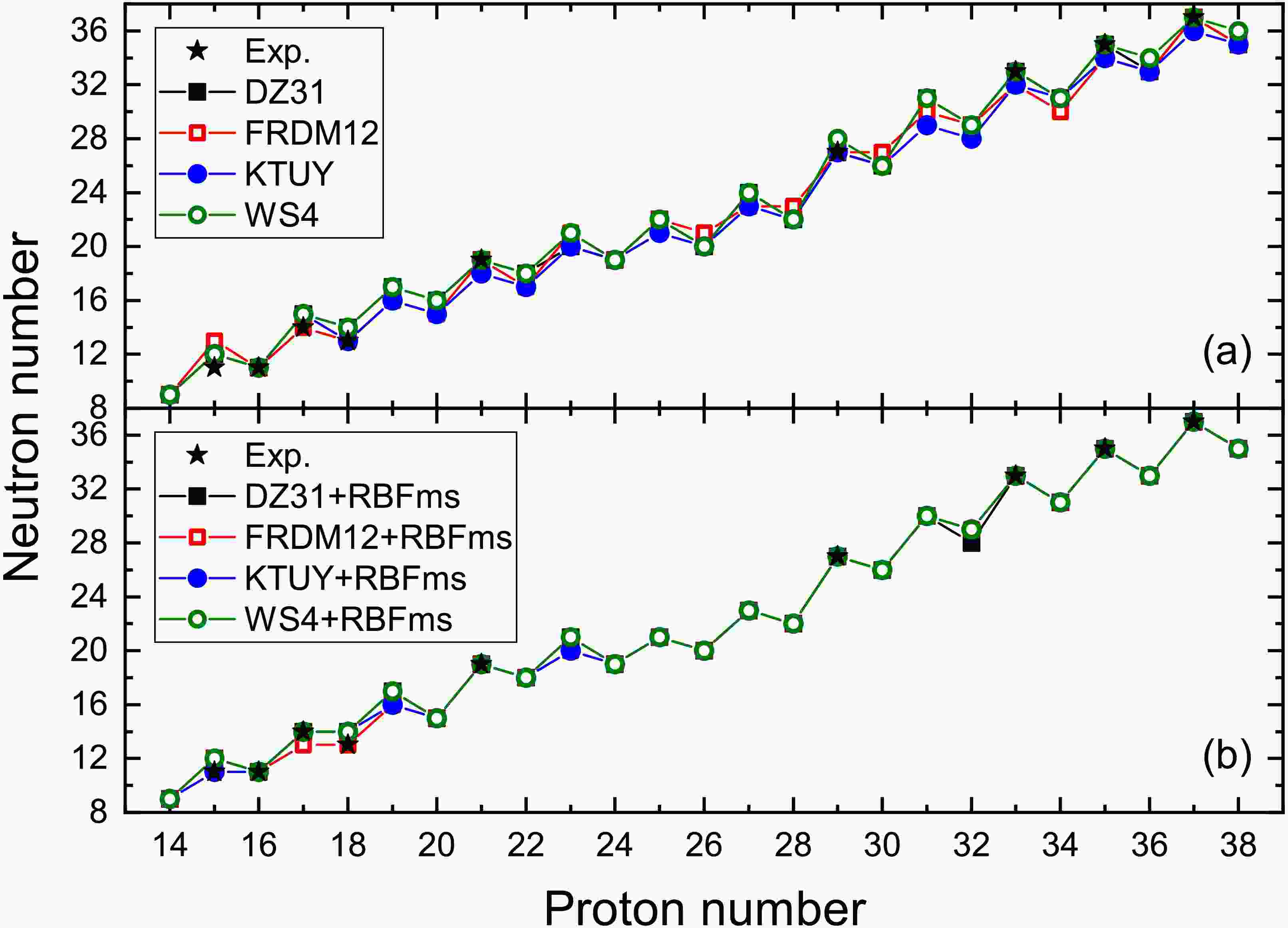 $ Z=14-38 $ through an integrated method combining DZ31, FRDM12, KTUY, and WS4 mass models with the RBFms approach. This learning set used for prediction also incorporates the test set data mentioned above. The proton drip line positions in isotope chains are determined by distinct criteria for odd-Z and even-Z nuclei. For odd-Z nuclei, the outermost nucleus with positive one-proton separation energy ($ S_{\rm{p}} > 0 $ ) defines the drip line boundary. For even-Z nuclei, the criterion involves two-proton separation energy ($ S_{\rm{2p}} > 0 $ ), where the outermost nucleus satisfying this condition marks the drip line position. Figure 3 illustrates the proton drip line positions for nuclei with$ Z=14-38 $ predicted by the DZ31, FRDM12, KTUY, and WS4 models, including results predicted by their combined with the RBFms approach. Figure 3 demonstrates that while the DZ31, FRDM12, KTUY, and WS4 models yield quantitatively similar predictions, observable discrepancies persist. However, upon integration with the RBFms approach, the results from these models exhibit significantly improved consistency across most cases. This further demonstrates the effectiveness of the RBFms approach. Finally, Table 1 presents the predicted average values of one-proton and two-proton separation energies for a small number of atomic nuclei (possibly the ground-state two-proton decay nuclei). These average values are calculated by combining the prediction results of the DZ31, FRDM12, KTUY and WS4 models with the RBFms approach.