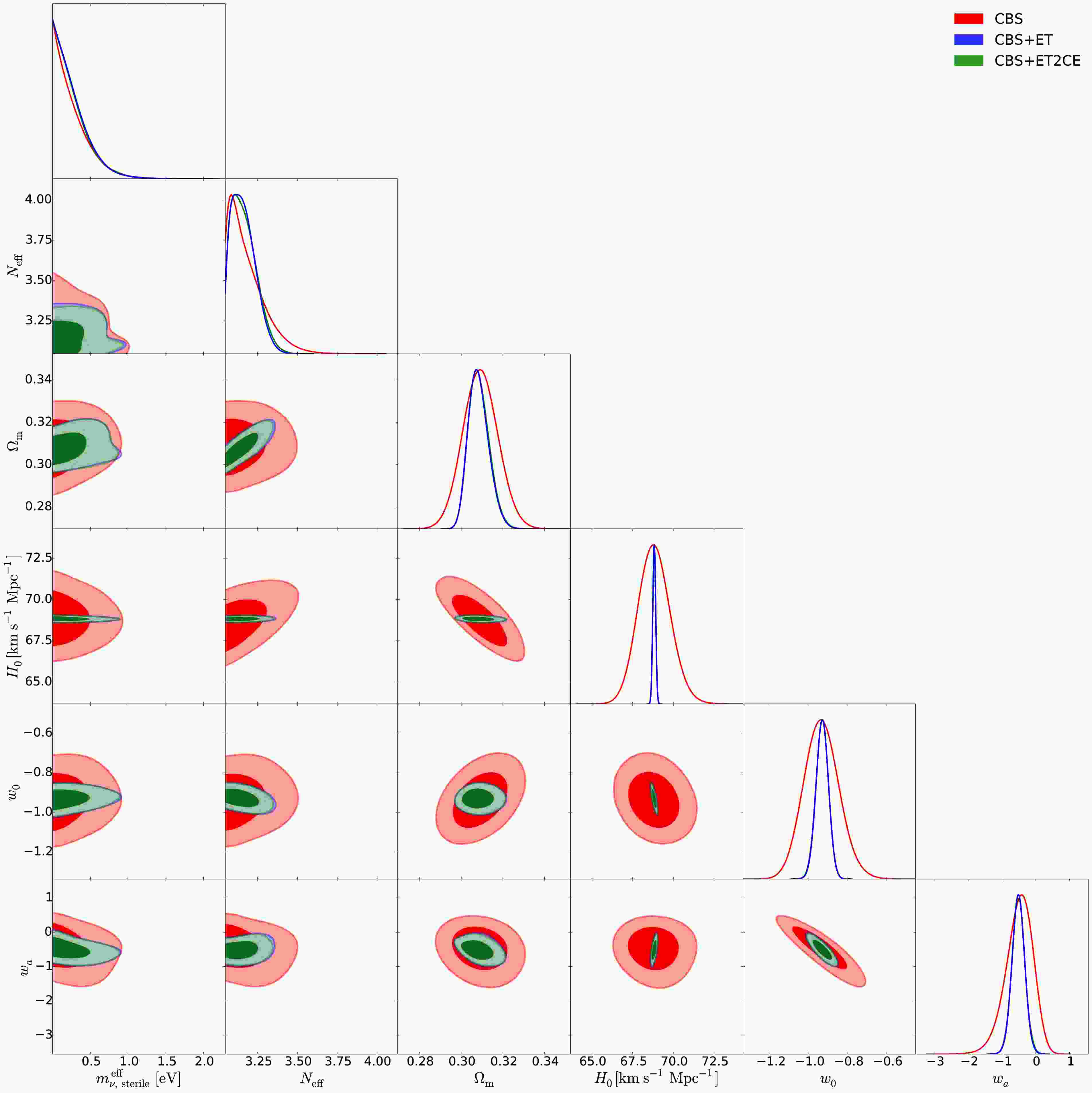 $\mathtt{CosmoMC}$ [178] to infer the posterior probability distributions of the cosmological parameters. To demonstrate the impact of simulated GW data on constraining sterile neutrino parameters, we will analyze two scenarios of 3G GW observations: a single ET and the ET-CE-CE network, which consists of one ET detector and two CE-like detectors (one in the United States with a 40 km arm length and another one in Australia with a 20 km arm length, hereafter referred to as ET2CE). We utilize the ET sensitivity curve provided in Ref. [179] and the CE sensitivity curves from Ref. [180], as presented in Fig. 1 of Ref. [39]. For the GW detectors, due to the large uncertainty in the duty cycle, we consider only the ideal scenario in which all detectors are assumed to have a 100% duty cycle, as discussed in Ref. [181]. The geometry of the GW detector, characterized by parameters such as latitude ($ \varphi $ ), longitude ($ \lambda $ ), opening angle ($ \zeta $ ), and arm bisector angle ($ \gamma $ ), is described in detail in Table I of Ref. [39]. To ensure a direct comparison of constraints within the same parameter space, we adopt the best-fit cosmological parameter values from the CBS dataset as the fiducial values for simulating GW data in dynamical DE models. Thus, in our analysis, we use three data combinations: (1) CBS, (2) CBS+ET, and (3) CBS+ET2CE. We will report the constraint results in the next section.Figure 1. (color online) he triangular plots of the marginalized posterior distributions for cosmological parameters in the wCDM+
