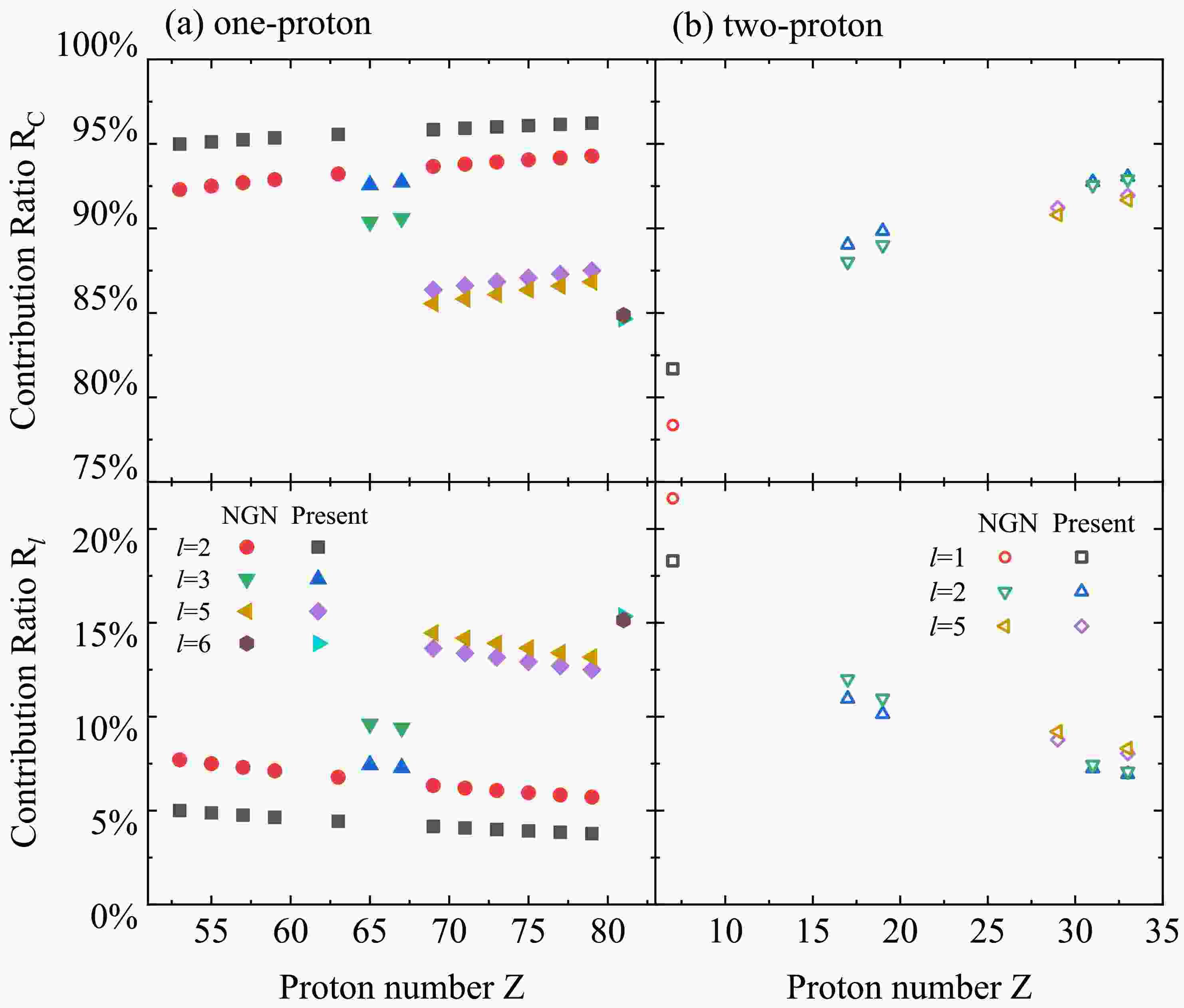 $R_C$ and$R_l$ represent the fractional weights of the Coulomb and centrifugal components in the composite quantity$Z_d^{\alpha}+bl^{\beta}$ , and therefore provide a direct measure of the importance of the long-range Coulomb potential and the relatively shorter-range centrifugal potential, respectively.In Fig. 4 the extracted contribution ratios for all one-proton and two-proton emitters are displayed. Several systematic trends can be observed. From the left two panels for one-proton emission cases, we can see that for low angular momentum one-proton emitters such as with