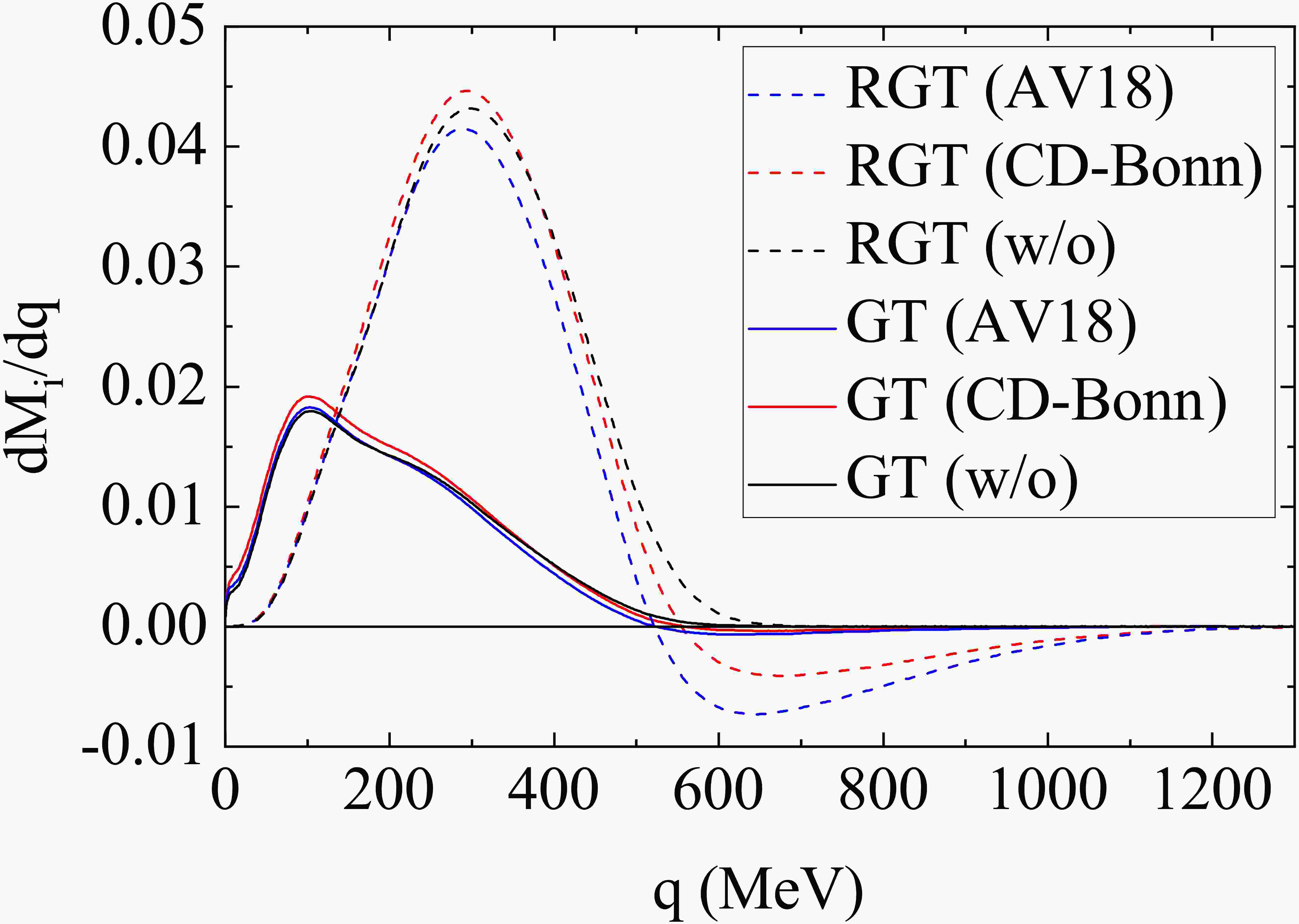 To understand the origin of this large reduction of SRC on the RGT part, we present the transfer momentum distributions of the matrix elements