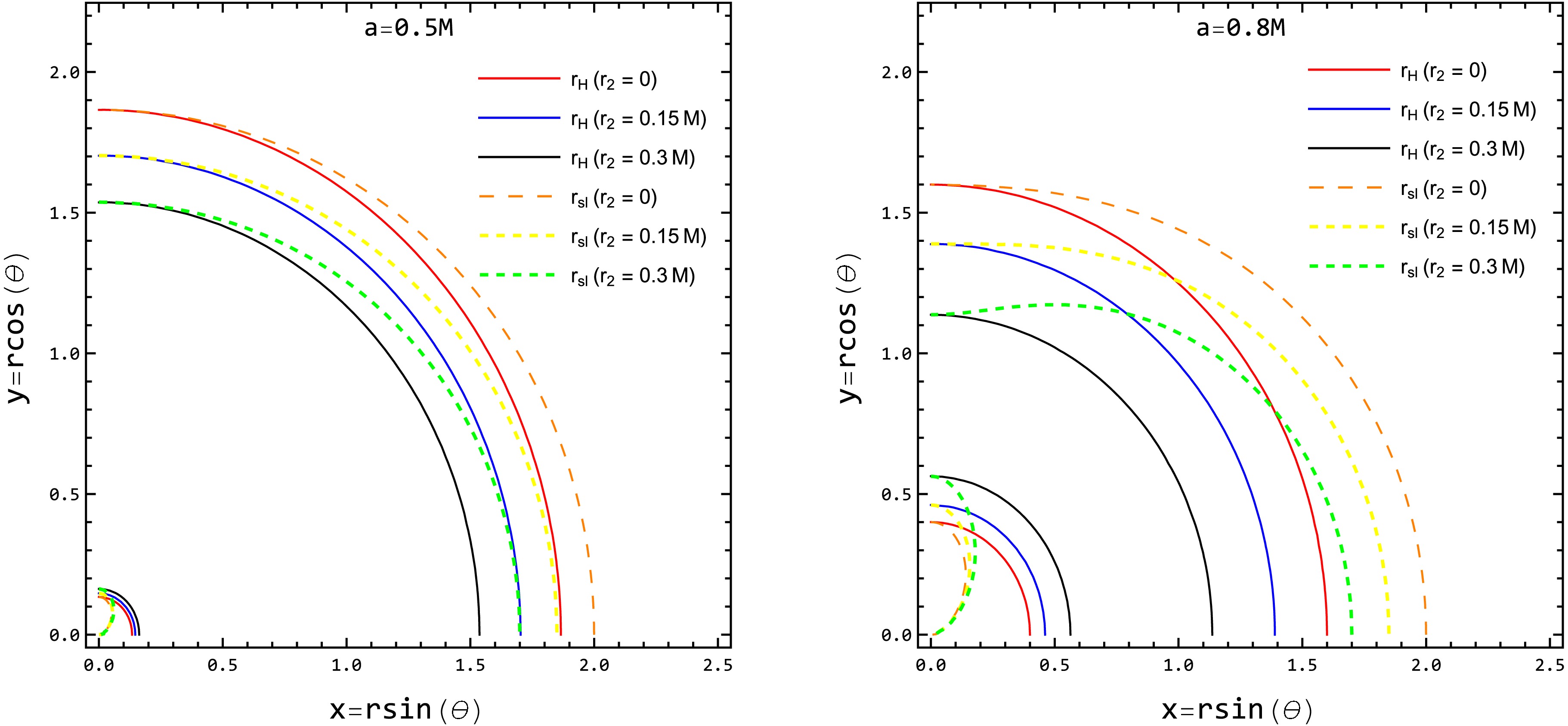 $ r_{\pm} $ of the Kerr–Sen BH is determined by$ \tilde{\Delta}=0 $ , which follows$\begin{aligned}[b] & r_+=M-\frac{r_2}{2}+\sqrt{\left(M-\frac{r_2}{2}\right)^{2}-a^{2}},\\ & r_-=M-\frac{r_2}{2}-\sqrt{\left(M-\frac{r_2}{2}\right)^{2}-a^{2}}.\end{aligned} $