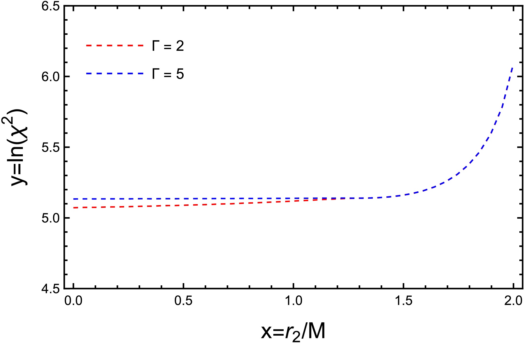 $ \chi^2 $ with the dilaton parameter$ r_2 $ for six binary BHs. The red dashed line represents the situation when$ P_{\text{jet}} $ corresponding to$ \Gamma=2 $ is used to calculate the$ \chi^2 $ , while the blue dashed line is associated with the scenario when$ P_{\text{jet}} $ corresponding to$ \Gamma=5 $ is considered for evaluating the$ \chi^2 $ .The Fig. 4 illustrates the variation of the logarithm of the