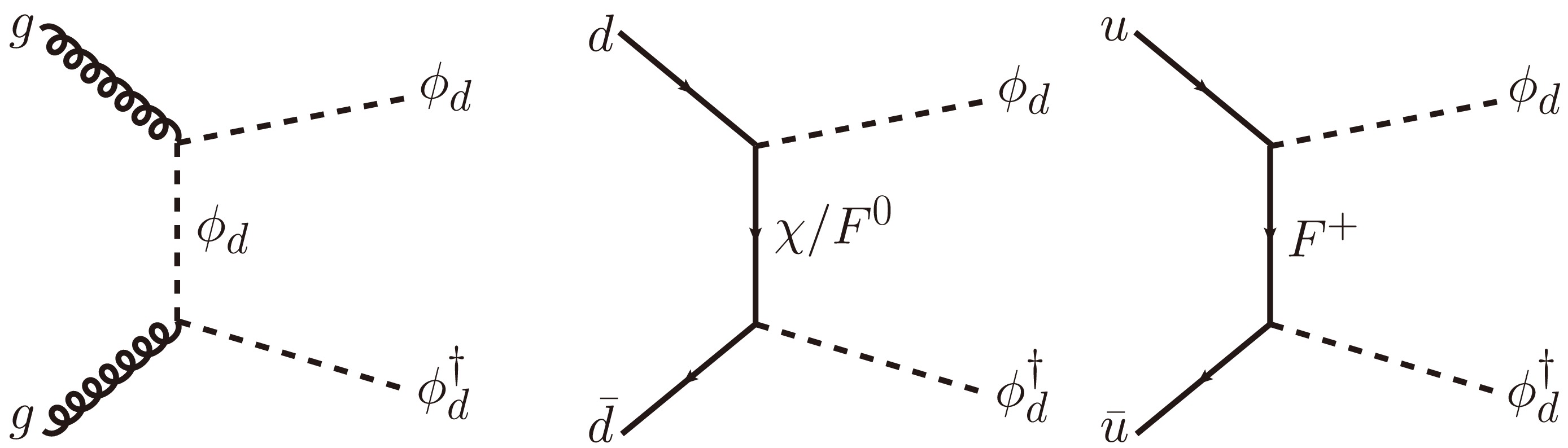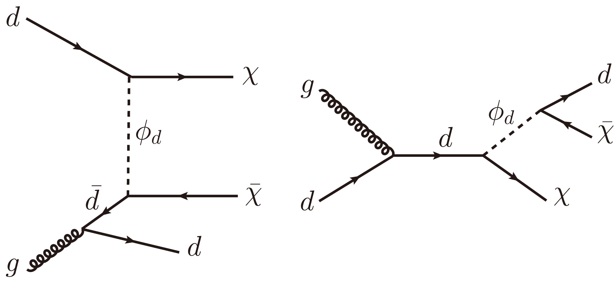 $ pp\to \phi_d^{+1/3} \phi_d^{-1/3} $ ,$ \phi_d^{\pm1/3} \to \chi j $ ;The signal processes SJ1 and SJ2 for DM production at the LHC are categorized as monojet
