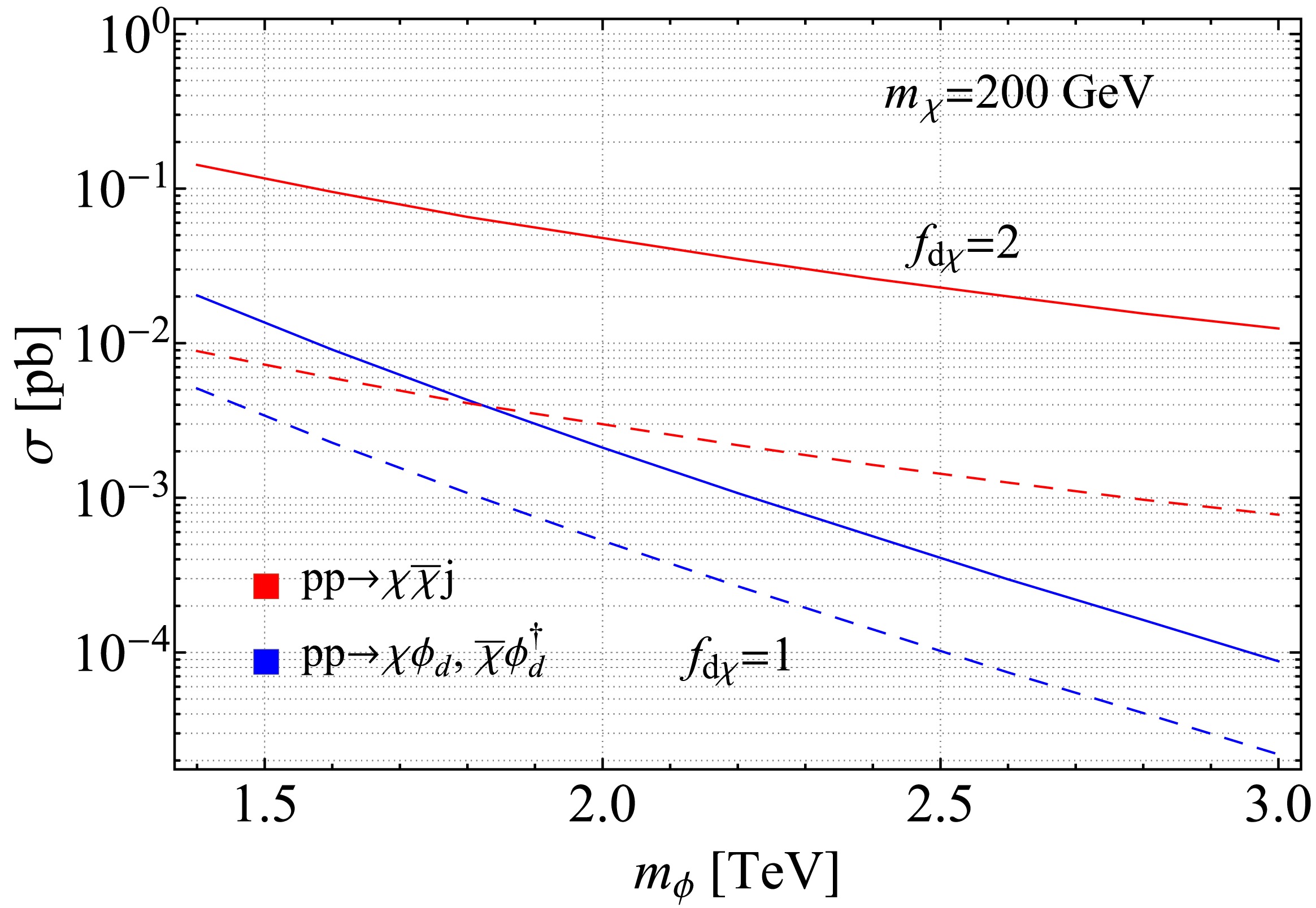 $ +\not E_T $ channel at the 13 TeV LHC for the assumptions of$ f_{d\chi}=2 $ (solid) and$ 1 $ (dashed), and$ m_\chi = 200 \; \text{GeV} $ .In the dijet