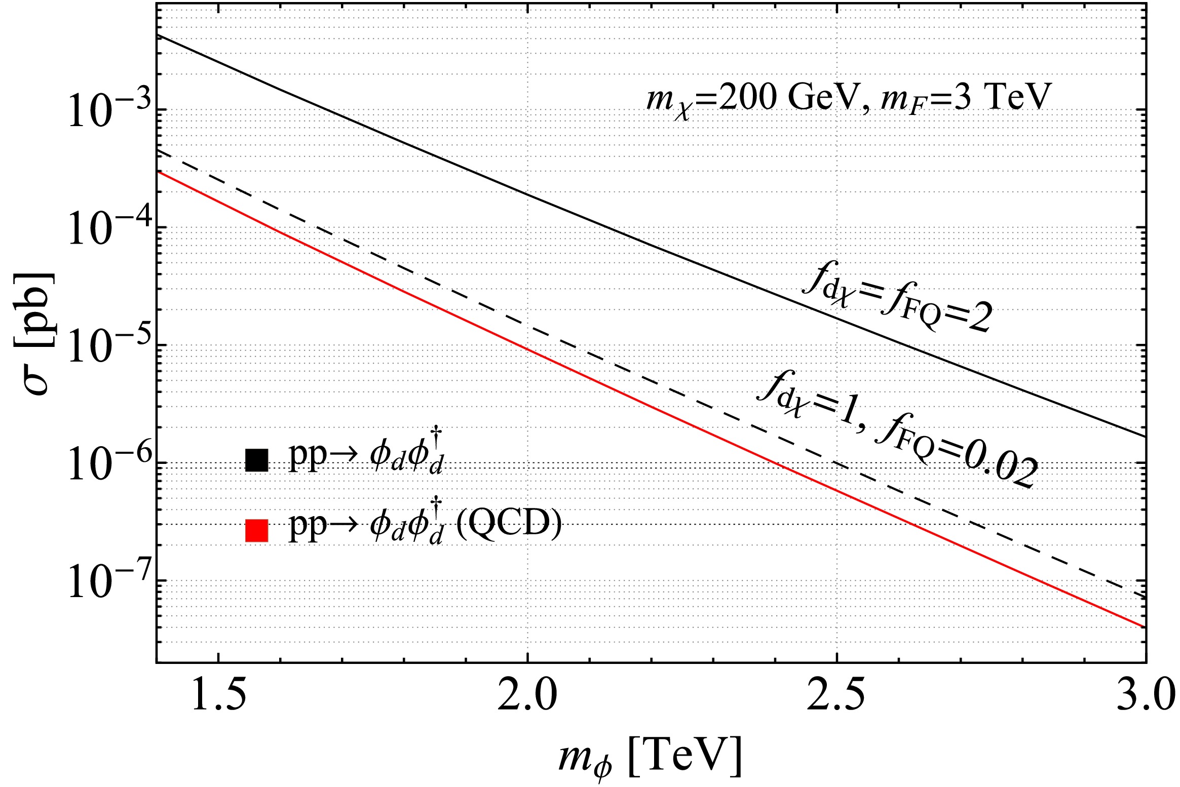 $ +\not E_T $ channel with two jets at the parton level, the DM χ is produced from the decay of colored mediator$ \phi_d $ . In Fig. 13, we show the representative diagrams for the production via QCD or new physics interactions, respectively. The cross section for the QCD production of$ \phi_d \phi_d^\dagger $ (red line), and benchmark cross sections for the new physics production at the 13 TeV LHC under the assumptions of$ m_\chi=200 \; \text{GeV} $ ,$ m_F=3 \; \text{TeV} $ , and$ f_{d\chi}=f_{FQ}=2 $ (black thick line), or$ f_{d\chi}=1 $ ,$ f_{FQ}=0.02 $ (black dashed line) are illustrated in Fig. 14. We find that the total production cross section is significantly enhanced for substantial new physics couplings, which agrees with the findings in Ref. [15]. In our parameter space of interest, the cross section of new physics production always dominates over that of QCD production.