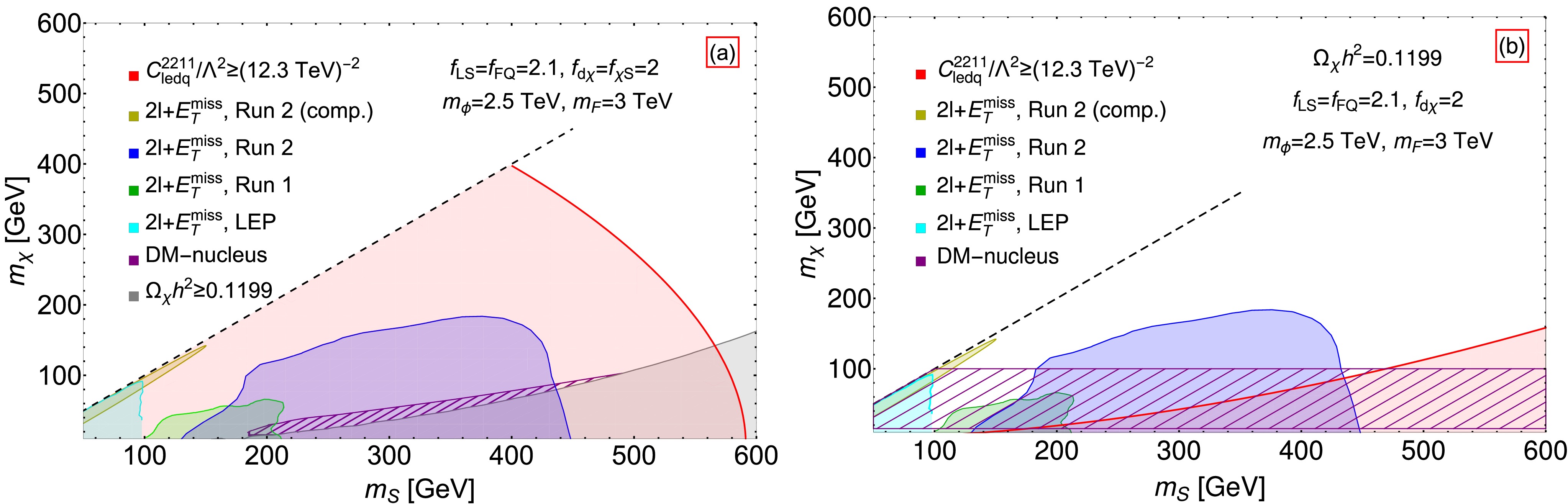 $ m_\chi $ and the scalar mass$ m_S $ for BM (a) and BM (b) with$ f_{d\chi} = 2.0 $ ,$ f_{LS}=f_{FQ}=2.1 $ ,$ m_\phi = 2.5 \; \text{TeV} $ and$ m_F = 3 \; \text{TeV} $ . Left:$ f_{\chi S} =2.0 $ and$ \Omega_\chi h^2 \leq 0.119 $ are required for BM (a). Right:$ f_{\chi S} $ is determined by$ \Omega_\chi h^2 = 0.119 $ for BM (b). The projected future LFC constraint$ C_{ledq}^{2211}/\Lambda^2< (12.3\; \text{TeV})^{-2} $ [25, 26] from the neutrino NSI measurements is expected to exclude the red shade area. Constraints from existing dilepton$ +\not E_T $ searches as the same as those in Fig. 10. The exclusion resulting from the current constraint from DM direction detection in the LZ experiment [55] is depicted by the purple slash shading region. The dashed line represents$ m_\chi = m_S $ .