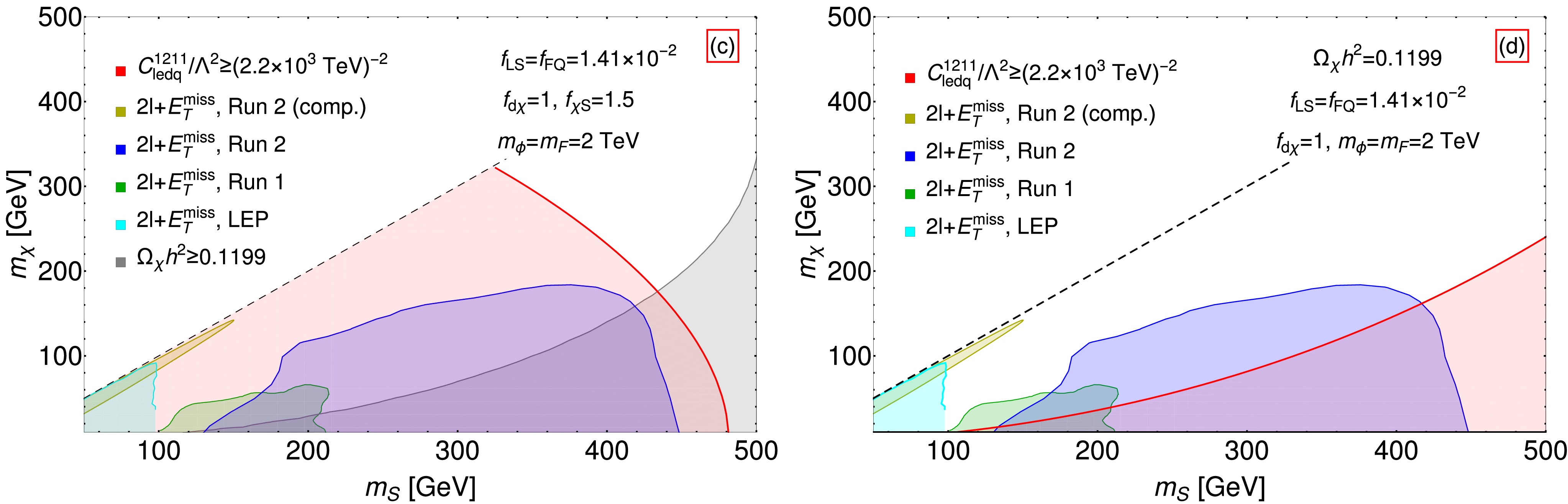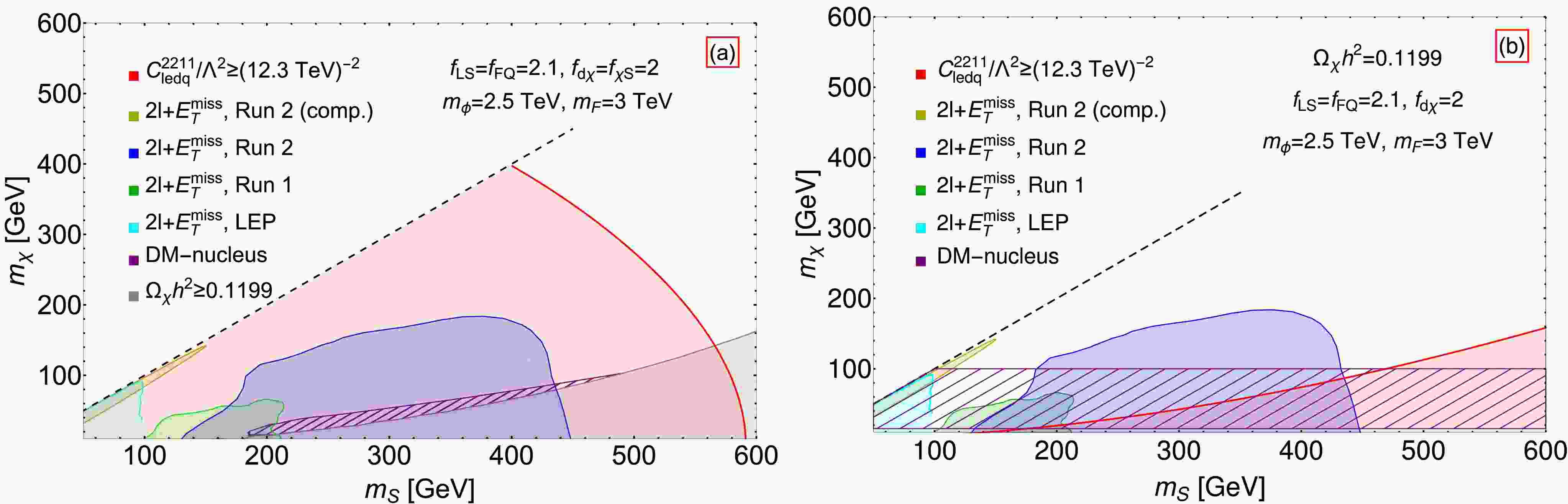 $ f_{\chi S} $ is considered as an independent parameter, the model-independent constraints on the Wilson coefficients$ C_{ledq}^{22 11} $ and$ C_{ledq}^{12 11} $ provide a complementary investigation of the parameter space of the DM mass$ m_\chi $ and scalar mass$ m_S $ , which extends the reaches of collider searches in the diplepton+$ \not{E}_T $ channel and DM direct detection, especially for the region where$ m_\chi $ and$ m_S $ are close.In the cases of BM (b) and BM (d), the coupling