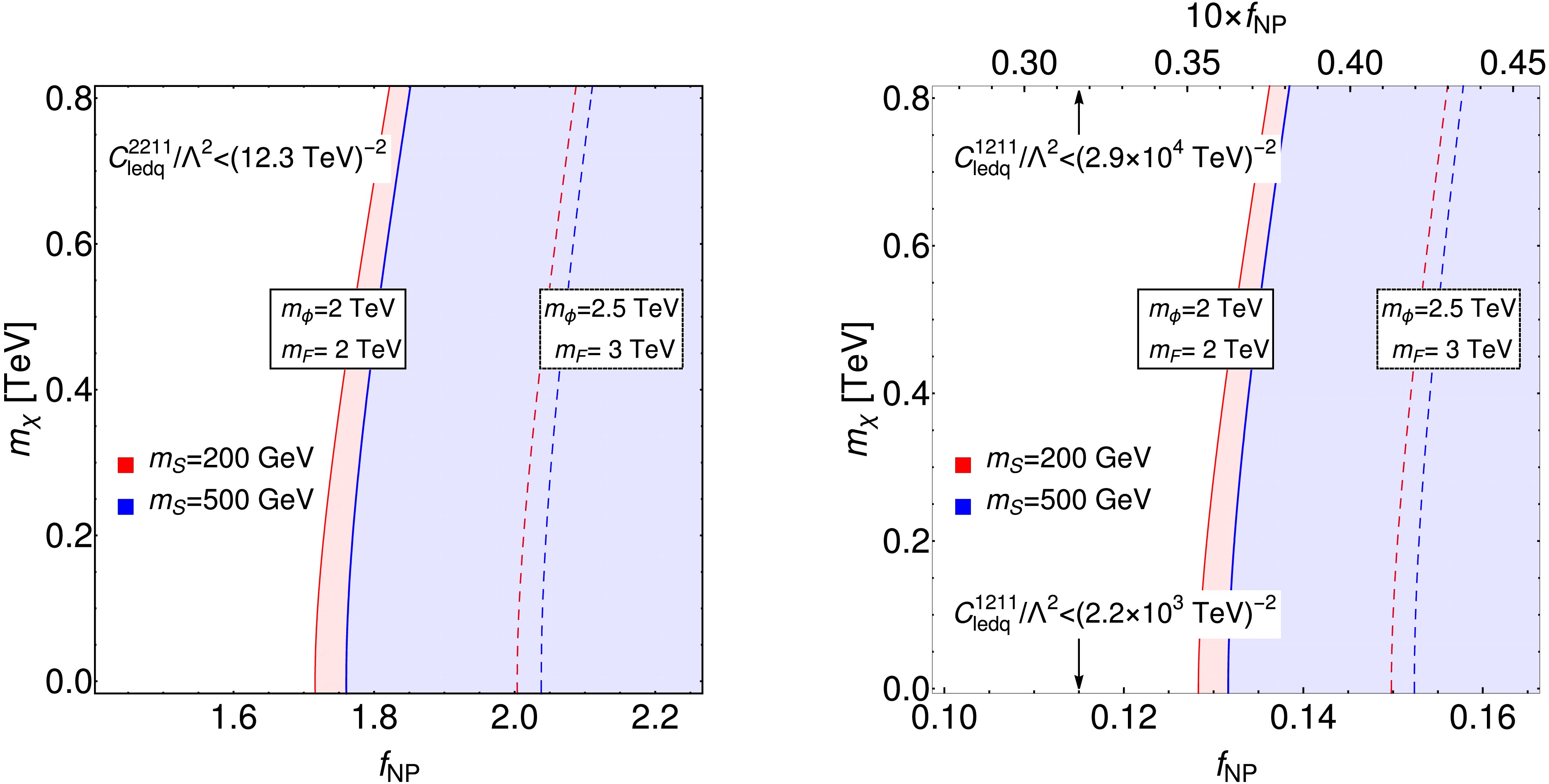 $ f_{{\rm{NP}}} $ and$ m_\chi $ for the assumptions of the masses$ m_\phi =2.5\; \text{TeV}\; (2 \; \text{TeV}) $ , and$ m_F = 3\; \text{TeV}\; (2 \; \text{TeV}) $ with solid (dashed) curves. The shaded regions in red (blue) color indicate exclusion for$ m_S = 200\; \text{GeV}\; (500 \; \text{GeV}) $ . Left:$ C_{ledq}^{22 11}/\Lambda^2< (12.3\; \text{TeV})^{-2} $ is depicted for$ f_{{\rm{NP}}} $ in the lower axis. Right:$ C_{ledq}^{12 11}/\Lambda^2< (2.2 \times 10^3 $ $ \text{TeV})^{-2} $ and$ (2.9 \times 10^4\; \text{TeV})^{-2} $ are depicted for$ f_{{\rm{NP}}} $ in the lower and upper axes, respectively.In the case of the LFV operator, the current constraint on the Wilson coefficient
