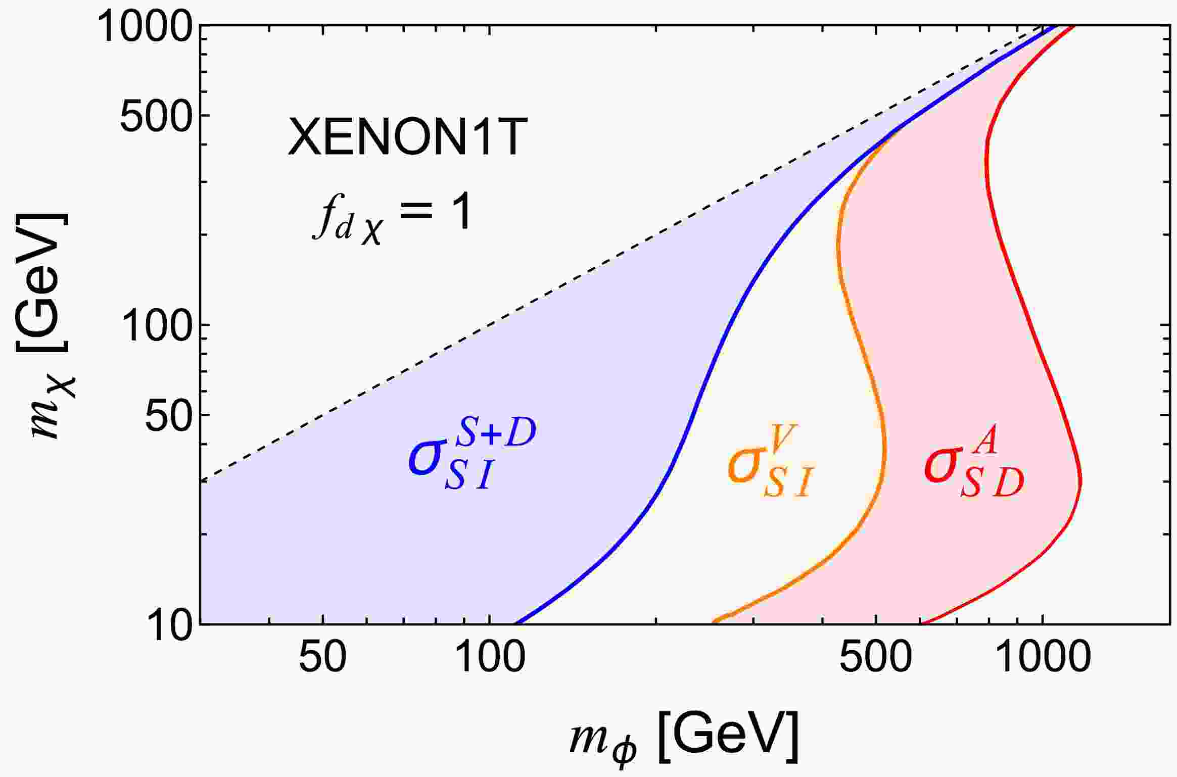 $ m_\chi $ and$ m_\phi $ for$ {\cal{O}}_V $ ,$ {\cal{O}}_A $ , and a combination of$ {\cal{O}}_S $ and$ {\cal{O}}_D $ by the XENON1T experiment with a 1 ton-year exposure [46, 52] under the assumption of$ f_{d\chi}=1 $ . The DM-nucleon SD cross section is attributed to the operator$ {\cal{O}}_A $ , while the SI cross sections from$ {\cal{O}}_V $ and the combination of$ {\cal{O}}_S $ and$ {\cal{O}}_D $ are analyzed separately.The suppression factor for the contributions to the SI cross section from the operators