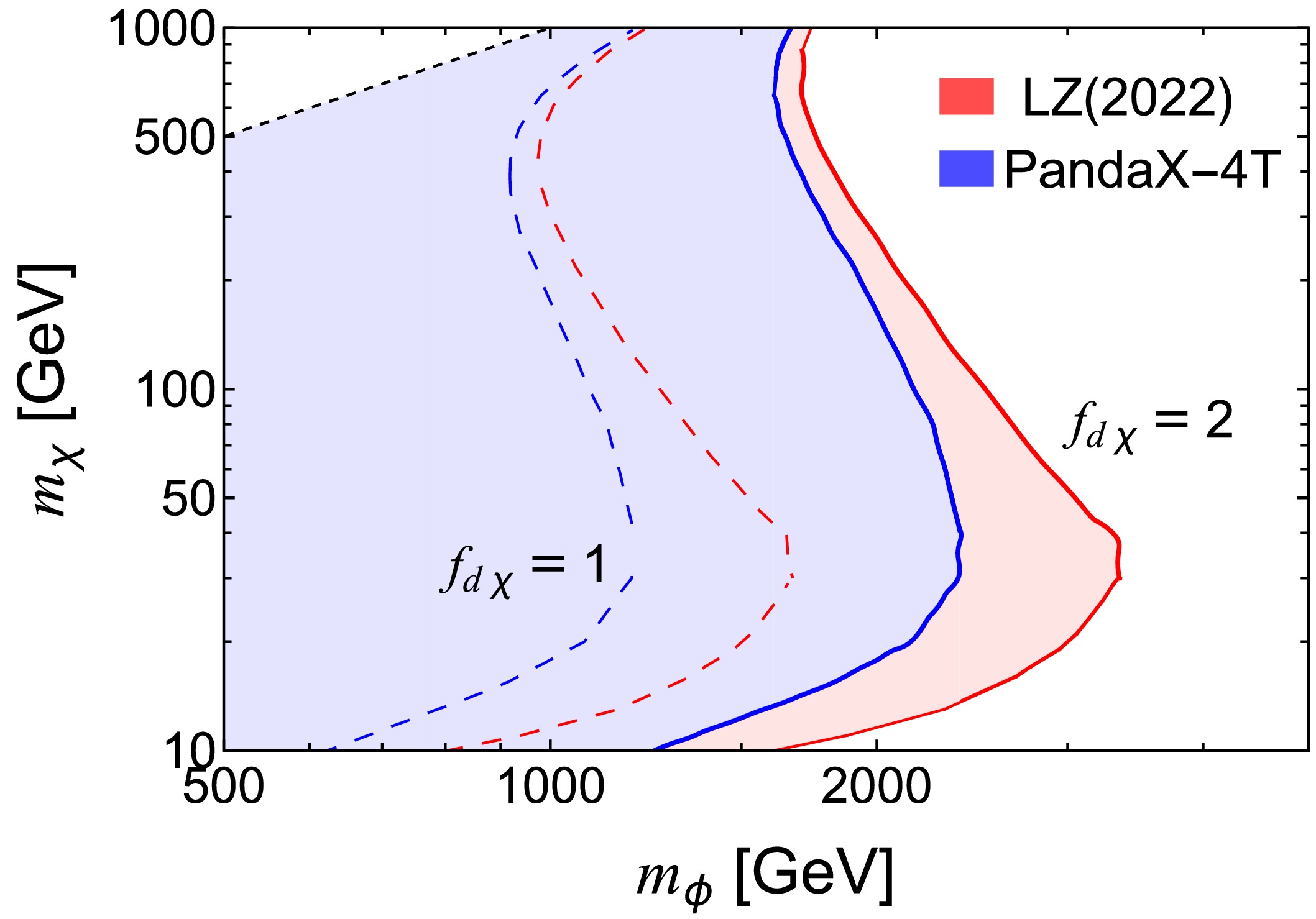 $ m_\chi $ and colored mediator mass$ m_\phi $ from the constraints on the SD cross sections measured in the LUX-ZEPLIN (LZ) experiment [55] and the PandaX-4T experiment [54] assuming coupling values$ f_{d\chi} = 1 $ or 2. Our result for$ f_{d\chi} = 1 $ using the limit by the LZ experiment agrees with Ref. [43]. It is important to mention that we assume the relic density of χ as the observed total DM relic density. If the DM relic density depends on a given$ f_{\chi S} $ , the limits could be notably weaker, as we will see in Sec. VII.It is noted that direct detection can also occur by exchanging photons at the one-loop level, which leads to much weaker direct detection signals compared to the contribution from exchanging