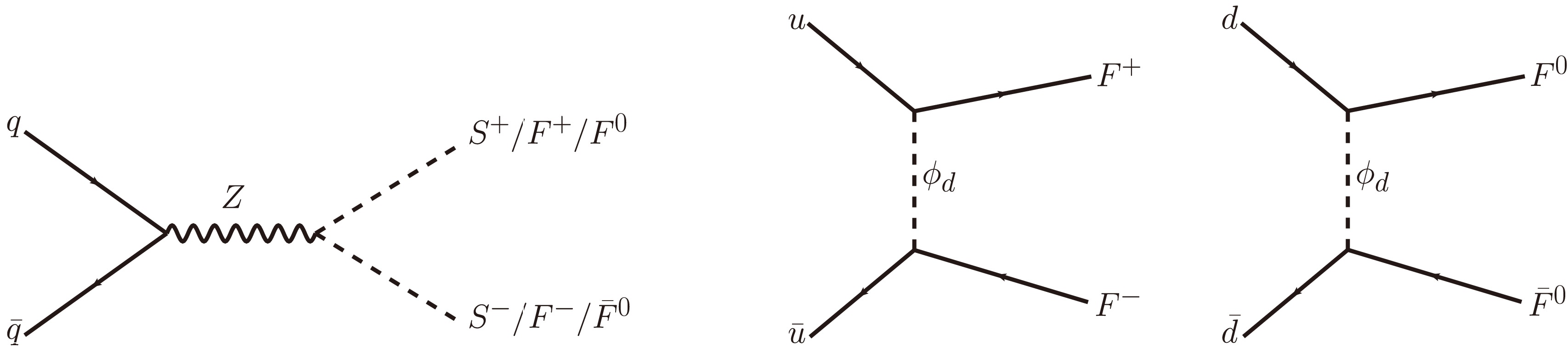 $ pp\to F^0 \bar{F}^0 $ ,$ F^0 \to S^+ \ell^- $ ,$ \bar{F}^0 \to S^- {\ell}^+ $ ,$ S^\pm \to \mu^\pm \chi $ ,$ \ell = e $ or μ.The corresponding Feynman diagrams for the production of