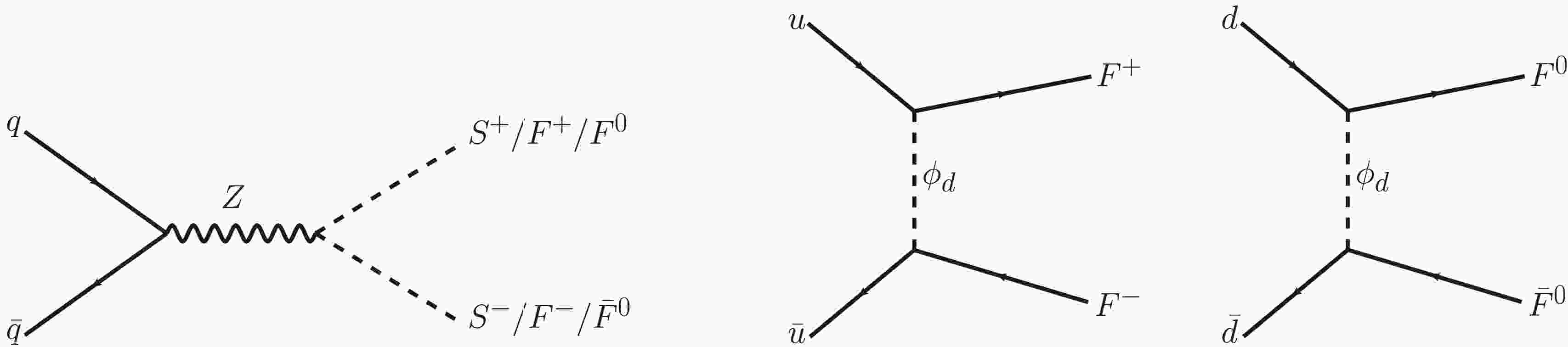 $ S^{\pm} $ ,$ F^{\pm} $ and$ F^0 $ . In the left panel,$ S^+ S^- $ and$ F^+ F^- $ can also be produced with the s-channel off-shell photon.