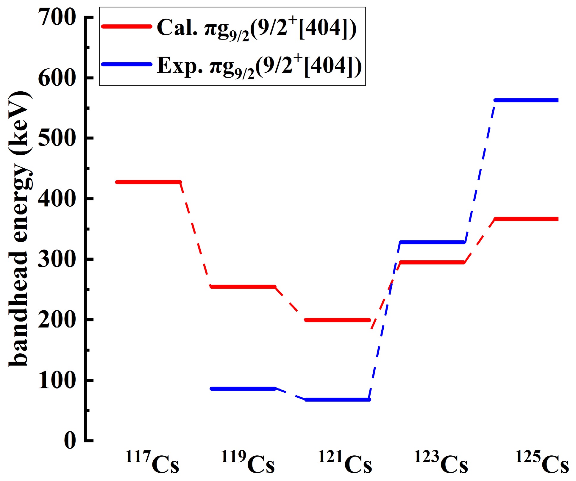 $ \pi[404] $ 9/2+ orbital in odd-even 117−125Cs. The experimental band-head energies are denoted by blue lines. The calculated band-head energies are denoted by red lines.The experimental data are taken from Refs. [9, 10, 12, 43]. -