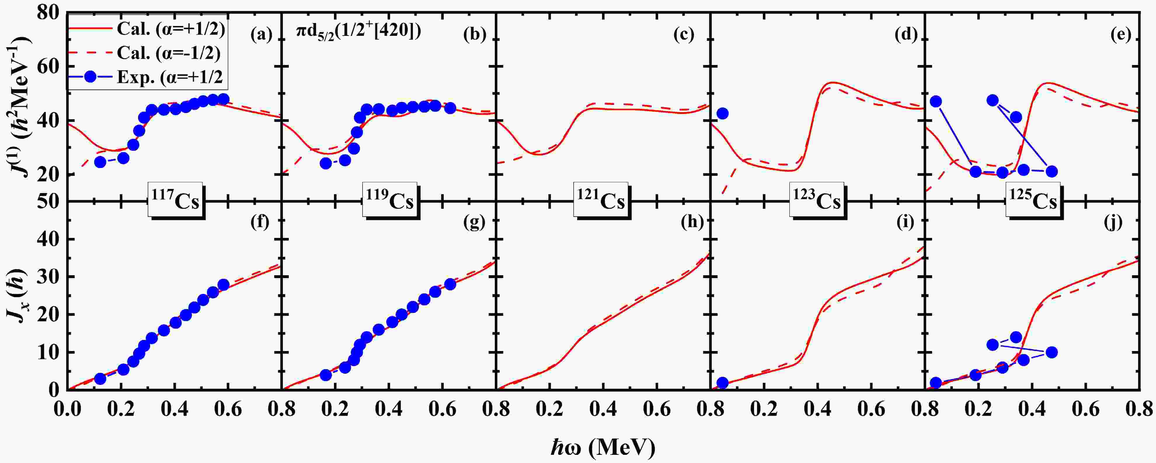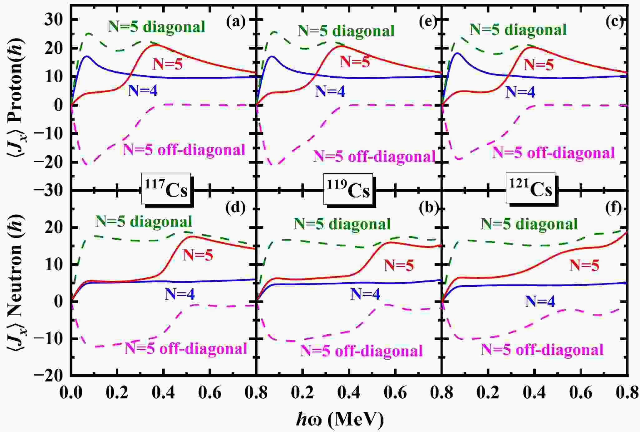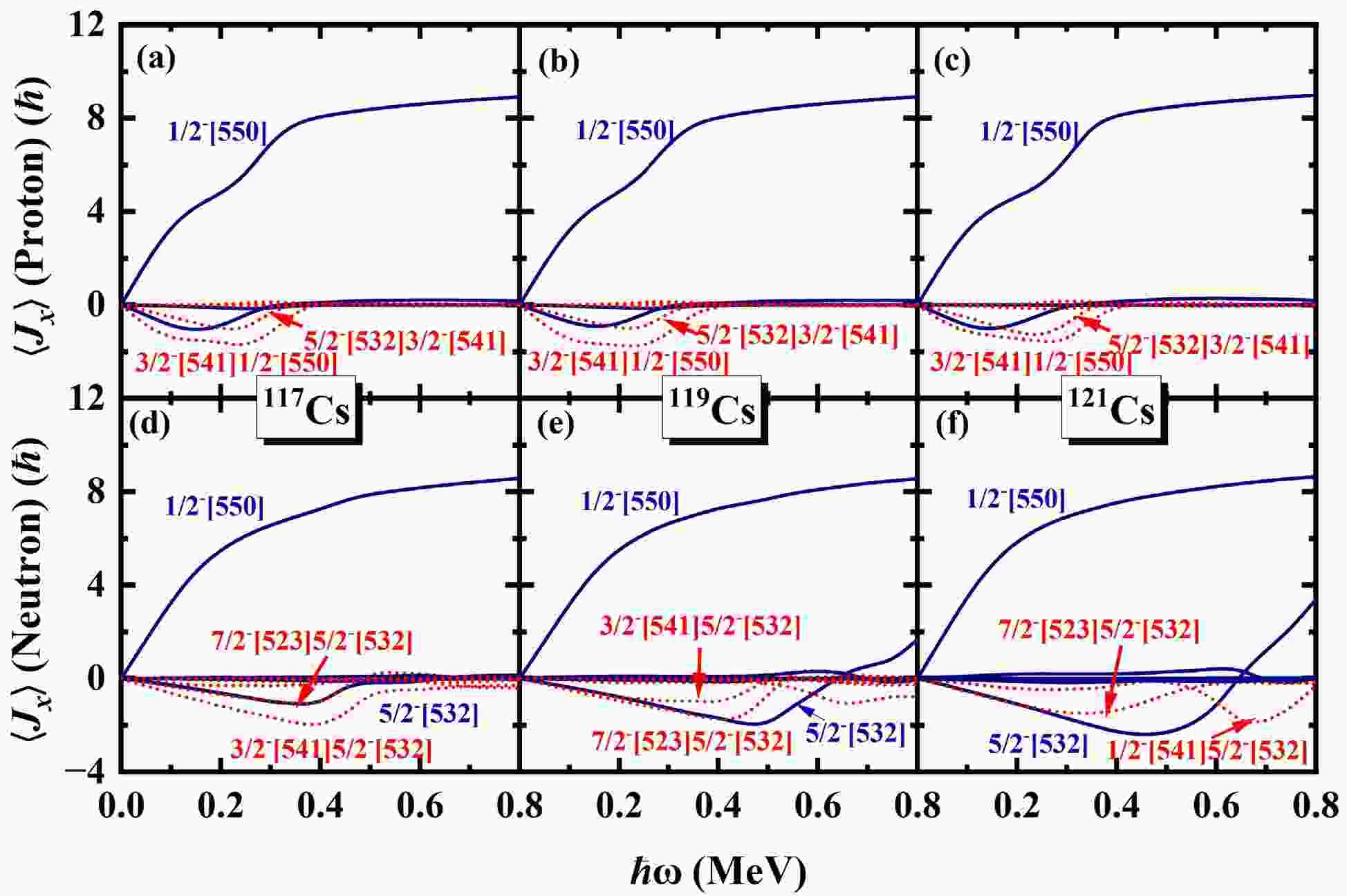 $ \alpha=+1/2 $ (top) and neutron orbital (bottom) in the$ N=5 $ major shell to the angular momentum alignments$ \langle J_x \rangle $ for the$ \pi d_{5/2} (1/2^+[420]) $ band in odd-even 117,119,121Cs. The diagonal (off-diagonal) part$ j_{x}(\mu) [(j_x(\mu\nu)] $ is denoted by blue solid (red dotted) lines.