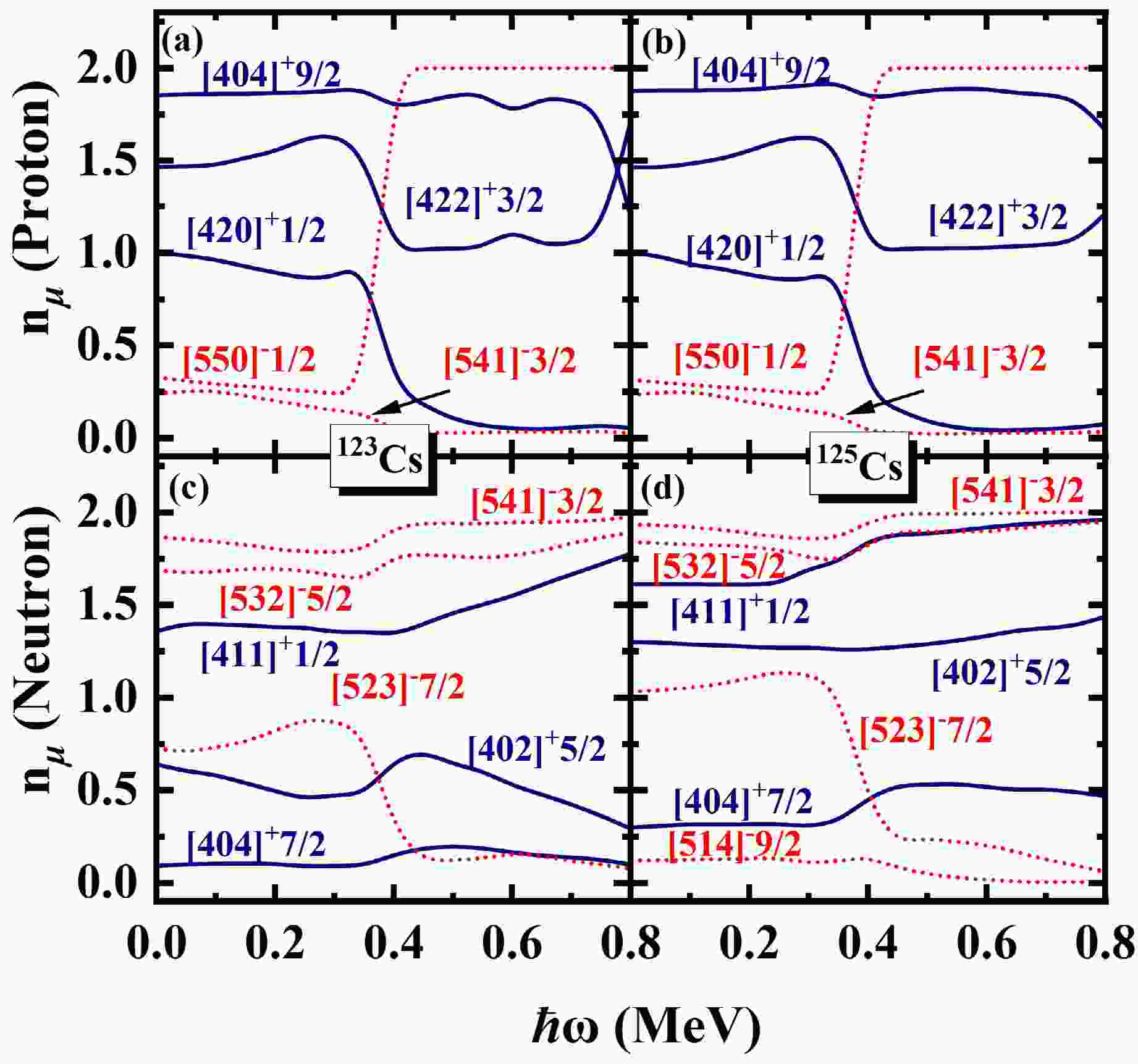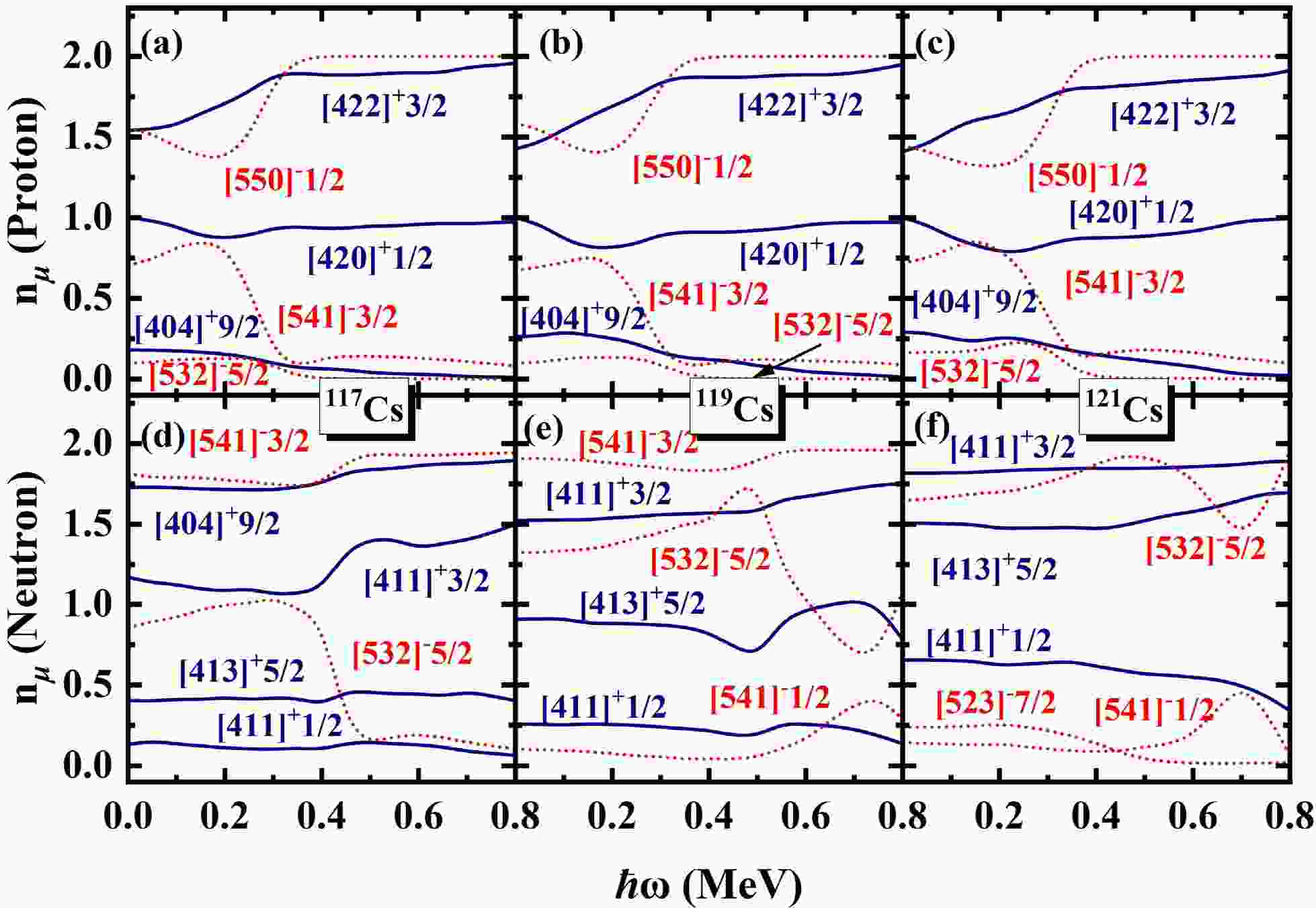 $ N=\sum_{\mu}n_{\mu} $ is exactly conserved, whereas the occupation probability$ n_{\mu} $ for each orbital varies with rotational frequency$ \hbar \omega $ . This is a key advantage of the PNC approach, as it allows for a more detailed investigation of the evolution of Nilsson levels with rotation. By analyzing the ω dependence of orbitals near to the Fermi surface, valuable insights into the upbending and backbending mechanism can be obtained. The occupation probability$ n_{\mu} $ of each orbital μ near the Fermi surface of the$ \pi d_{5/2} (1/2^+[420]) $ band in 117,119,121Cs are shown in Fig. 4. The top and bottom rows are for protons and neutrons, respectively. The positive (negative) parity is denoted by blue solid lines (red dotted lines). It is evident from Fig. 4, around the rotational frequency$ \hbar \omega\sim0.20 $ MeV for 117,119,121Cs, the occupation probability of π[550]1/2 ($ \pi h_{11/2} $ ) increases sharply from 1.5 to nearly 2.0, while the occupation probabilities of π[541]3/2 and π[532]5/2 decrease. This behavior can be understood from Fig. 2. With increasing$\hbar\omega $ , the$ \pi[541]3/2 $ and$ \pi[532]5/2 $ orbitals gradually move away from the Fermi surface, while the$ \pi[550]1/2 $ orbital approaches it. As a result, the occupation probabilities of the$ \pi[541]3/2 $ and$ \pi[532]5/2 $ orbitals decrease with increasing cranking frequency, whereas the occupation probability of the$ \pi[550]1/2 $ orbital increases. For the second upbending of 117,119,121Cs, it shows in Fig.4(d) the occupation probabilities of$ \nu[541]3/2 $ and$ \nu[411]3/2 $ increase around$ \hbar \omega\sim0.40 $ , while the occupation probability$ \nu[532]5/2 $ sharply decreases. In Fig.4(e), around the upbending frequency, the occupation probability of$ \nu[541]3/2 $ and$ \nu[532]5/2 $ increase, corresponding while other the occupation probabilities orbitals become smaller. For 121Cs, around$ \hbar \omega\sim0.70 $ MeV the occupation probability$ \nu[532]5/2 $ sharply increases, while the occupation probability$ \nu[541]1/2 $ decreases. Similarly, the occupation probability$ n_{\mu} $ of each orbital μ near the Fermi surface of the$ \pi d_{5/2} (1/2^+[420]) $ band in 123,125Cs are shown in Fig. 5. In Fig. 5, the occupation probability of$ \pi[550]1/2 $ increases gradually from nearly 0 to 2 around$ \hbar \omega\sim0.30 $ MeV, while the occpution of$ \pi[422]3/2 $ ,$ \pi[404]9/2 $ and$ \pi[420]1/2 $ decrease. For neutron, the occupation probability of ν[523]7/2 approaches 0 at$ \hbar \omega\sim0.30 $ MeV, meanwhile the occupation probabilities of other orbitals become larger. It can be seen that the first upbending of 117,119,121Cs mainly comes from the contributions of the$ \pi h_{11/2} $ orbitals and the second upbending of 117,119,121Cs mainly comes from the contributions of the$ \nu h_{11/2} $ orbitals. For 123,125Cs, the observed backbending arises predominantly from the combined contributions of both the$ \pi h_{11/2} $ and$ \nu h_{11/2} $ orbitals.