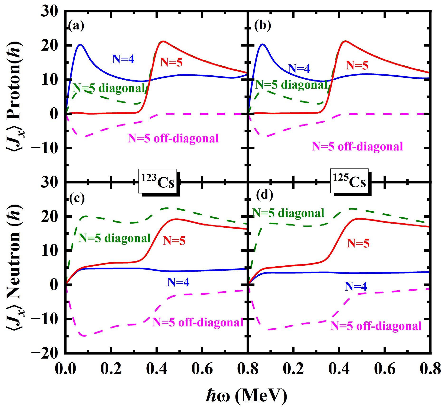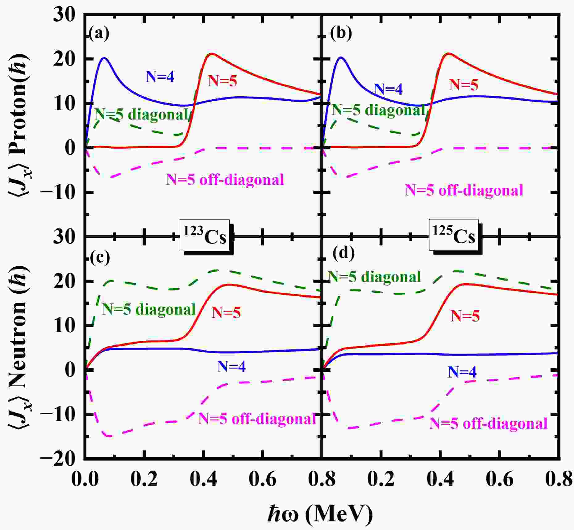 $ \left \langle J_x \right \rangle $ for the$ \pi d_{5/2} (1/2^+[420]) $ band in 117,119,121Cs. The contributions of diagonal$ \sum_{\mu}j_{x}(\mu) $ and off-diagonal$ \sum_{\mu<\nu}j_{x}(\mu\nu) $ from the neutron$ N=5 $ and proton$ N=5 $ major shells ($ \alpha=+1/2 $ ) are shown as dashed lines.