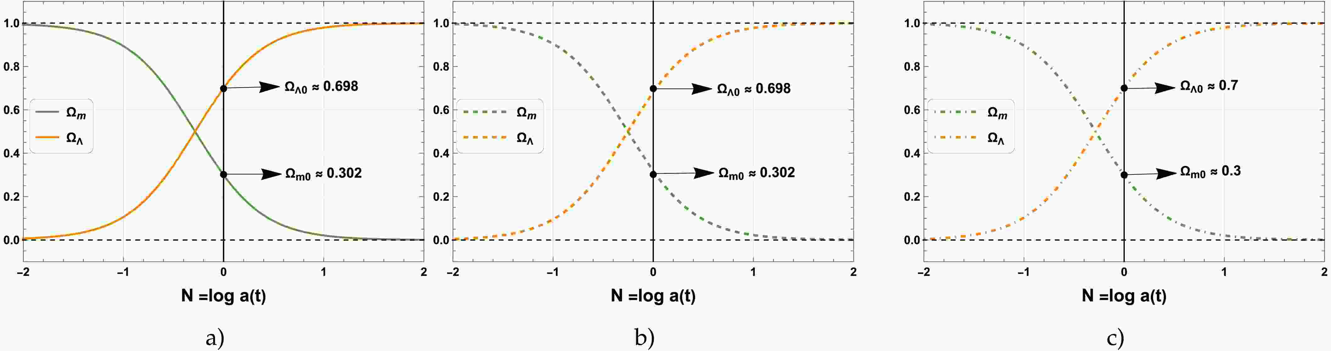 $ \omega_{{\rm{eff}}} $ and the deceleration parameter q as functions of$ N \equiv \log a(t) $ . The first, second, and third columns correspond to the dataset combinations DESI DR2 + CMB + Pantheon+, DESI DR2 + CMB + DES-Dovekie, and DESI DR2 + CMB + Union3, respectively. The vertical line at$ N=0 $ represents the present epoch, with$ N<0 $ and$ N>0 $ indicating the past and future epochs, respectively.The evolution of the density parameters corresponding to different observational data combinations namely DESI DR2 + CMB + Pantheon+, DESI DR2 + CMB + DES–Dovekie, and DESI DR2 + CMB + Union3 shows in Fig. 4a, Fig. 4b, and Fig. 4c, respectively. From the numerical solution of the dynamical system, the present-day value of the matter density parameter is found to be