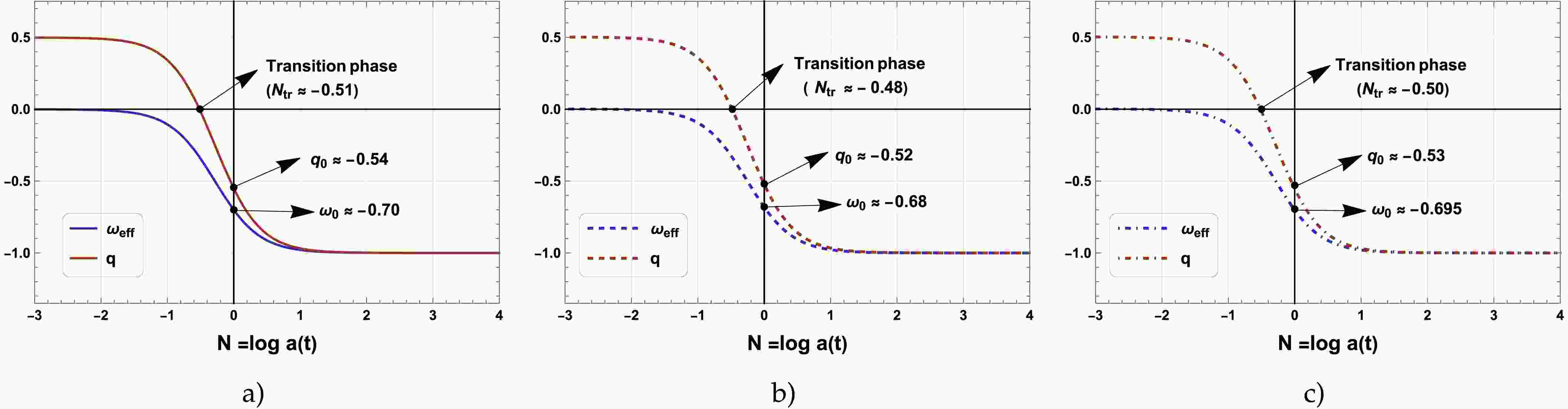 $ \omega_{eff} $ and the deceleration parameter q for the different datasets are presented in Fig 5. One can note that from Fig 5a, Fig 5b, and Fig 5c the current value of the effective EoS parameter are obtained as$ \omega_{eff}=-0.70 $ (DESI DR2 + CMB + Pantheon+),$ \omega_{eff}=-0.68 $ (DESI DR2 + CMB + DES–Dovekie) and$ \omega_{eff}=-0.695 $ (DESI DR2 + CMB + Union3) respectively. Finally, the evolution of the deceleration parameter q clearly shows the transition from the early decelerated era$ \left(q>0\right) $ to the late-time accelerated expansion era$ \left(q<0\right) $ . The transition from decelerated era to the accelerated era for$ \Lambda(t) $ CDM cosmological model is obtained at$ N_{tr}=-0.51 $ (DESI DR2 + CMB + Pantheon+),$ N_{tr}=-0.48 $ (DESI DR2 + CMB + DES–Dovekie) and$ N_{tr}=-0.50 $ (DESI DR2 + CMB + Union3) respectively. Also current value of the deceleration parameter for$ \Lambda(t) $ CDM model corresponding to three different datasets indicated in Fig. 5 are negative, which satisfies the observational results and represents the current accelerating expansion of the Universe. -