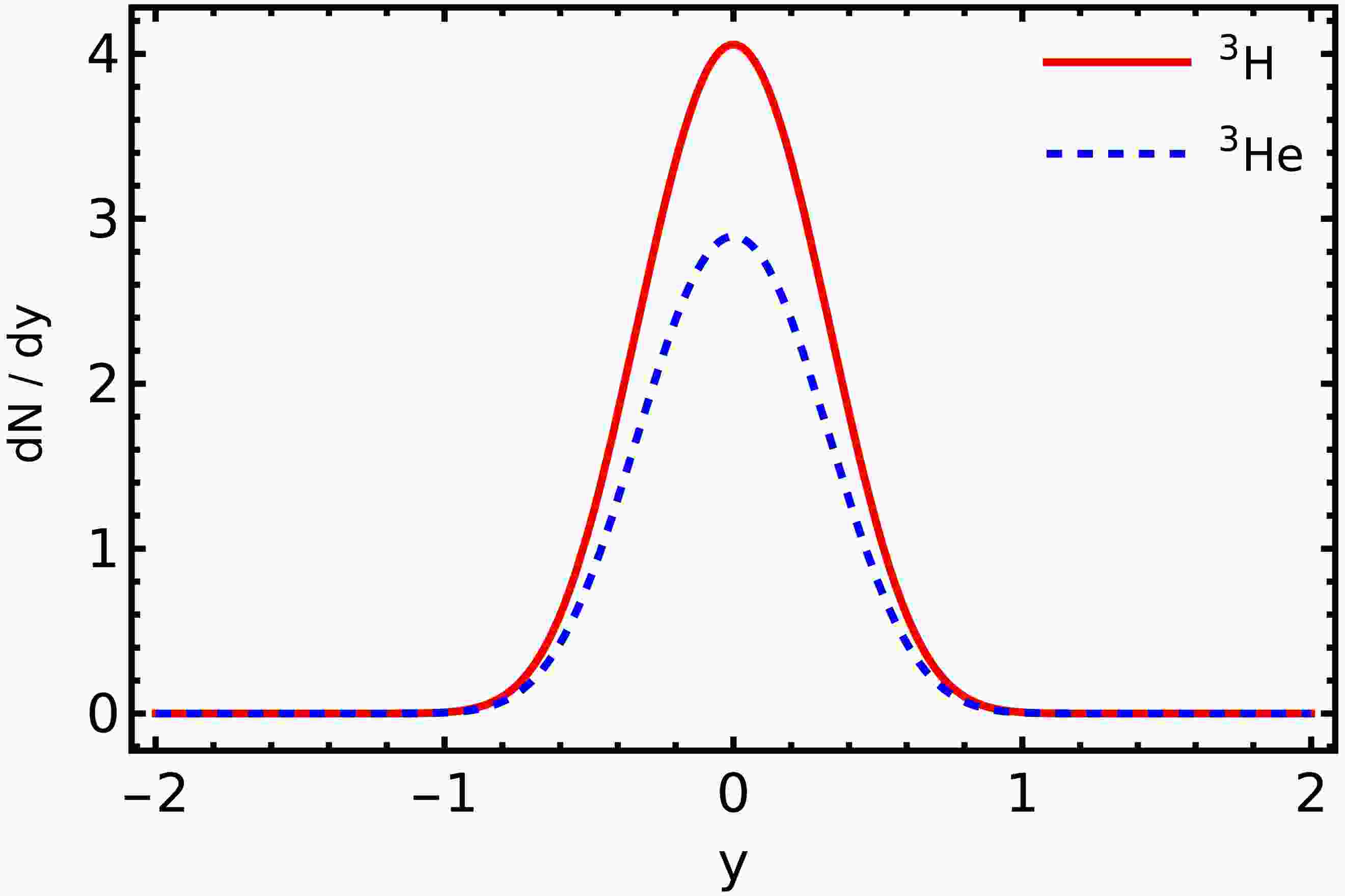 Figure 4. (color online) Predicted rapidity spectra of 3H (red solid line) and 3He (blue dashed line).