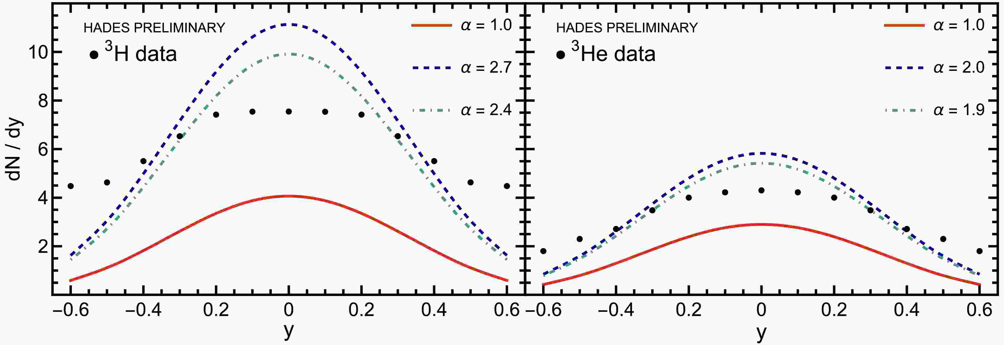 $ A_{{\rm{FR}}} $ whose calculation can be improved in the future by using more realistic wave functions of 3H and 3He. The comparison of the preliminary HADES results on the spectra shows that we are missing a factor of about 2 to reproduce the rapidity spectra.Since a similar factor is missing to reproduce the yields of both 3H and 3He, our approach reproduces rather well the experimental ratio of these two yields. The importance of the studies of such ratios has been recently stressed in [41]. Finally, we note that there might be other sources of the light nuclei production which enhance their yields, for example, the break-up of spectator nuclei [28, 42]. However, such a mechanism is not included in our model, which describes the production of particles in the participant zone only.