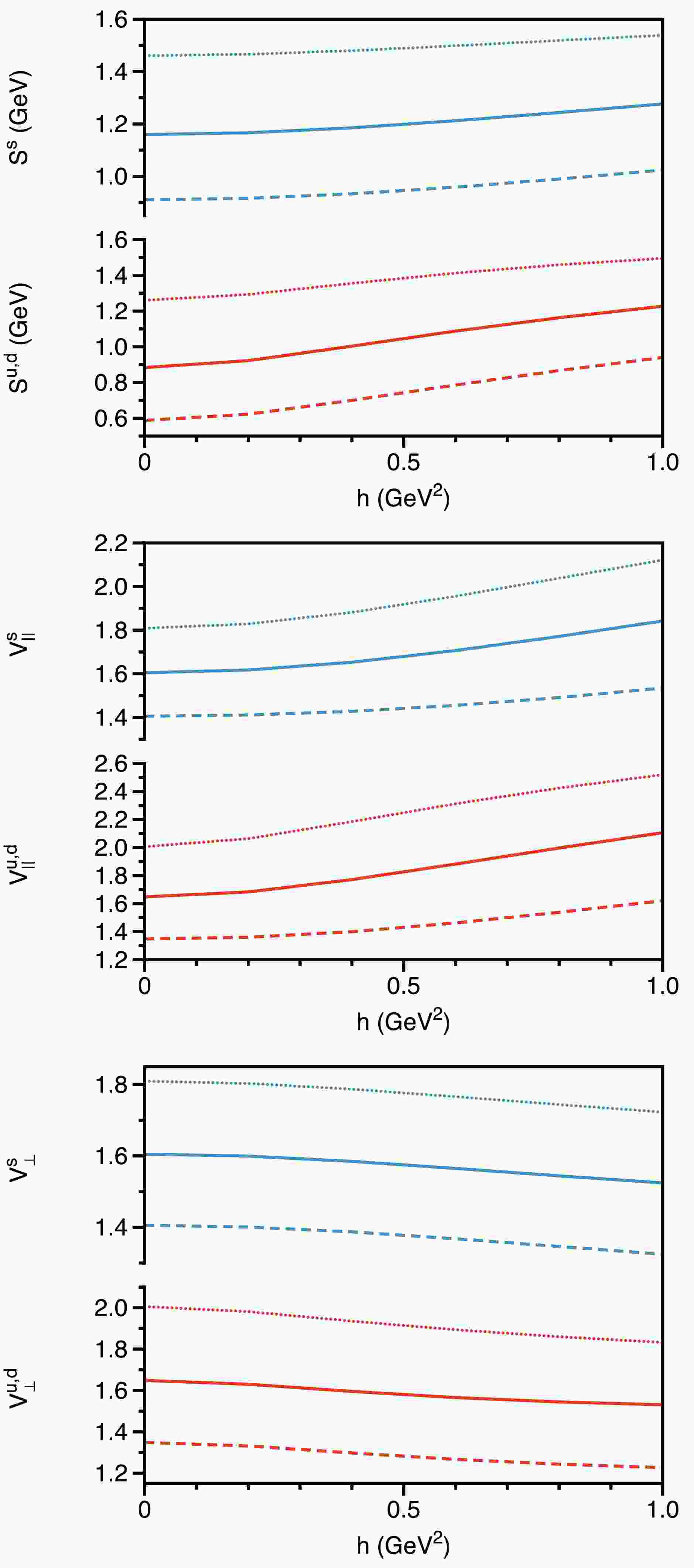$ \begin{aligned}[b] \Omega_1&=h^2{\cal{A}}_v^2\left({\cal{S}}^2+4h^2{\cal{T}}^2-2nh {\cal{V}}_\perp^2\right)\,,\\ \Omega_2&={\cal{V}}_\parallel^2\left({\cal{S}}^2+4h^2{\cal{T}}^2+2nh{\cal{V}}_\perp^2\right)\,,\\ \Omega_3&=8h^2{\cal{S}}{\cal{V}}_\parallel{\cal{A}}_v{\cal{T}}\,,\\ \Omega_4&=({\cal{S}}{\cal{V}}_\parallel-2h^2{\cal{A}}_v{\cal{T}})^2 +2nh{\cal{V}}_\perp^2({\cal{V}}_\parallel^2-h^2{\cal{A}}_v^2)\,. \end{aligned} $