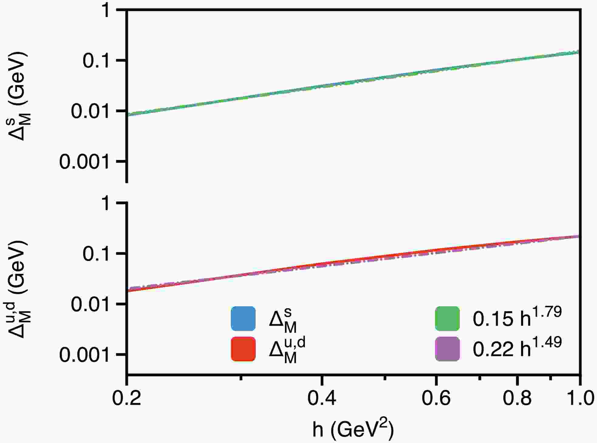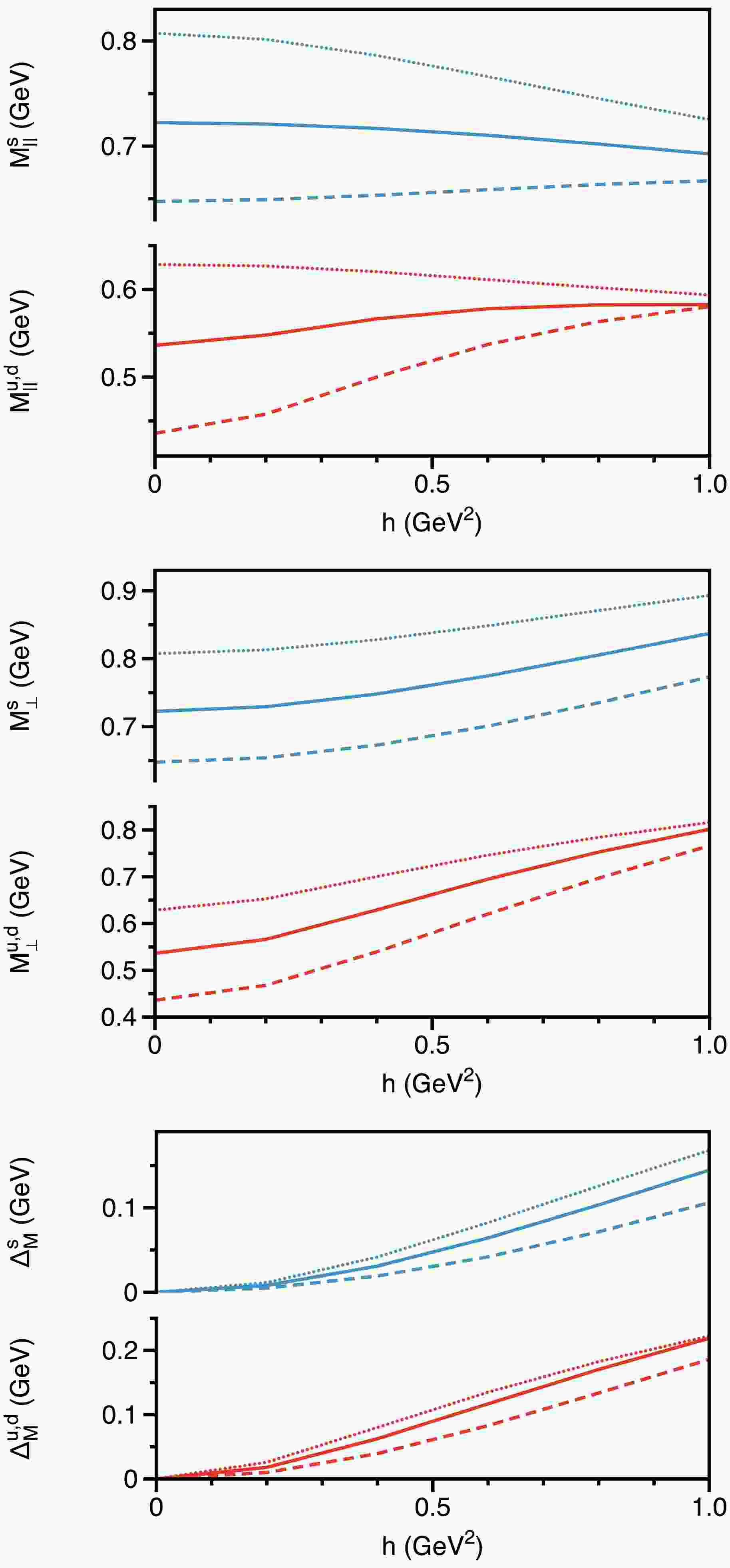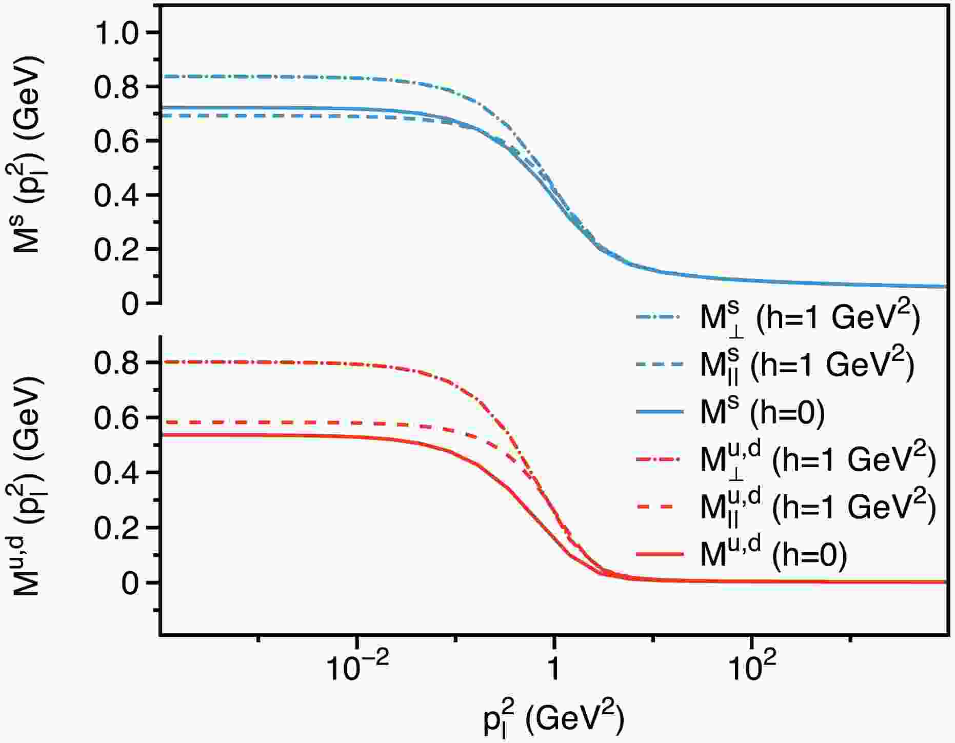 $ h\hat{\mathbb{A}} \Sigma^3\not{p}_\parallel $ ) and the tensor term ($ 2h \hat{\mathbb{T}}\Sigma^3 $ ) emerge as novel contributions in the presence of a magnetic field, vanishing when the magnetic field is absent. Both terms are coupled with$ \Sigma^3 $ , reflecting their role in the description of fine structures arising from interactions between quark spin and the external magnetic field, showing in more detail the subtle spin-dependent behavior in the quark propagator. Specifically, as shown in Eq. (32), the axial-vector term captures the asymmetry in longitudinal momentum between spin-up and spin-down states, while the tensor term accounts for asymmetry in masses between these states, which can be interpreted as a non-perturbative Zeeman effect. Additionally, the tensor term introduces further chiral symmetry breaking, complementing that from the scalar term$ \hat{\mathbb{S}} $ .Interestingly, two distinct effective masses can be defined for the quark in a magnetic field: the longitudinal mass