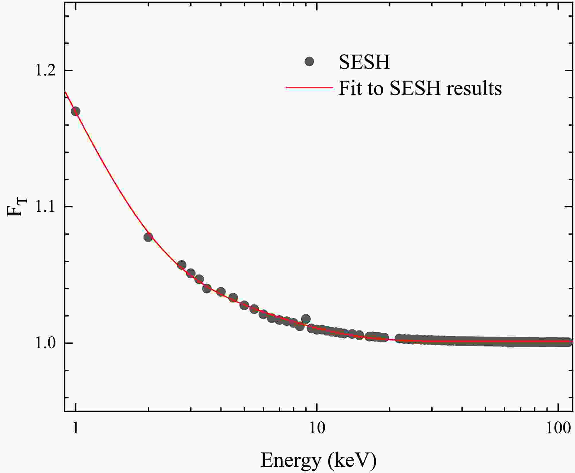 Figure 10. (color online) Self-shielding correction factor. Black points represent the SESH simulation, and the red curve shows the fit. The factor remains below 1.01 for neutron energies above 10 keV.