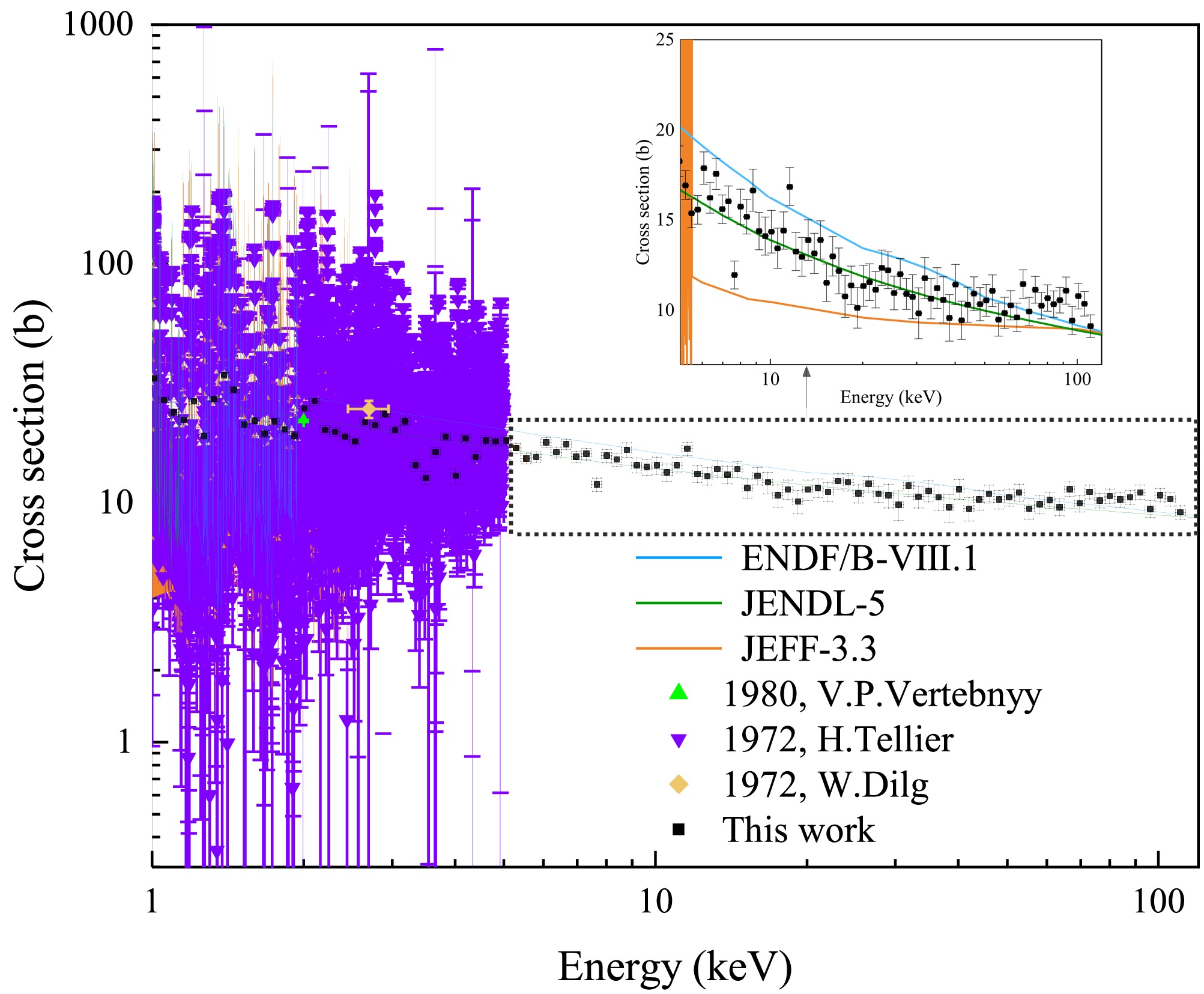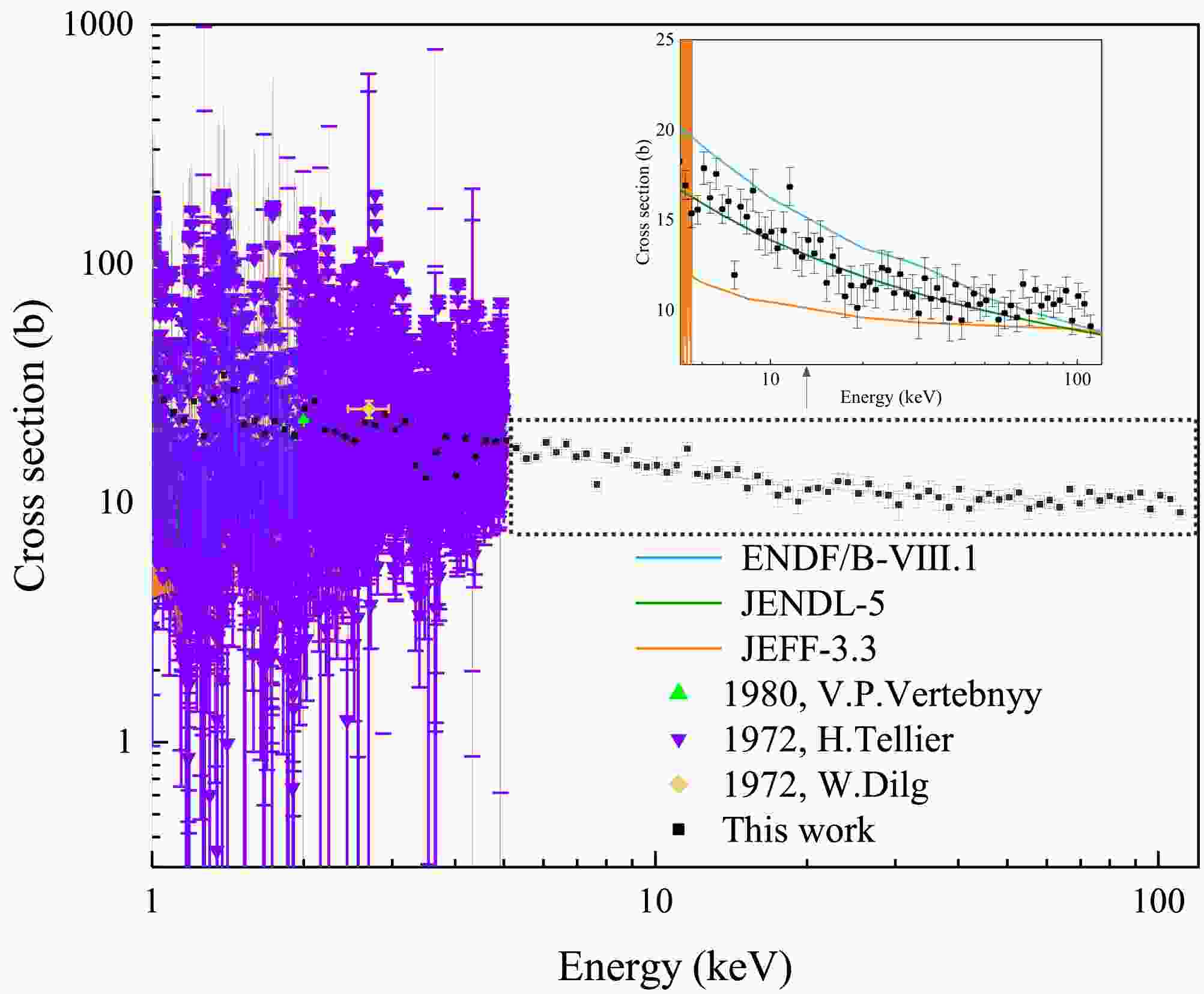 $ \Delta n $ is the standard uncertainty of the areal density of the sample. The relative uncertainty areal density is approximately 0.19%, which is negligible compared to the uncertainty of the transmission. In the energy range of 1 keV to 3 keV, the relative uncertainty of the total cross section remained below 5%. In the energy range of 3 keV to 110 keV, most of the uncertainties are below 10%. -
