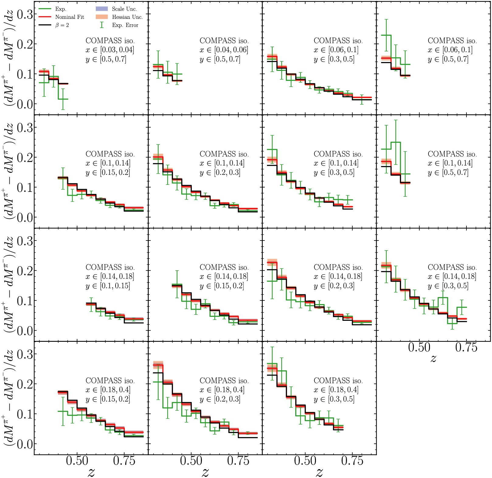 $ \beta=2 $ for COMPASS measurements of pion multiplicity difference with iso-scalar target. Scale uncertainties are shown in shaded bands and estimated by varying$ \mu_R/{\mu_{R,0}}=\mu_F/{\mu_{F,0}}=\mu_D/\mu_{D,0}= $ $ \{1/2,1,2\} $ and taking the envelope. Hessian uncertainties are evaluated by the Hessian method. Experimental uncertainties shown are quadratic sum of statistical and uncorrelated systematic uncertainties. Each panel represents different kinematic regions in x and y.