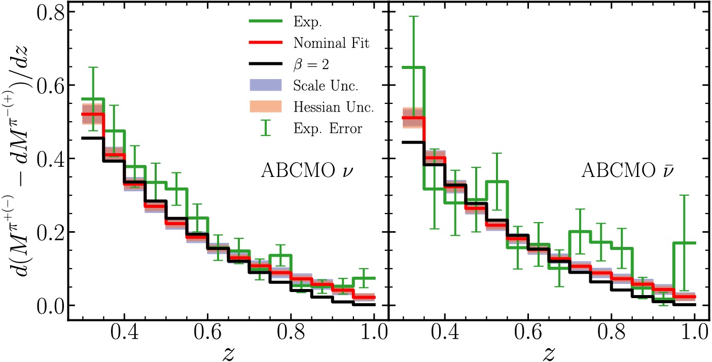 $ N_{pt} $ ,$ \chi^2 $ ,$ \chi^2/N_{pt} $ , and the effective Gaussian variable$ S_E $ . Note in estimation of the Hessian uncertainties, we use a$ \Delta\chi^2 $ tolerance being square of the maximal effective Gaussian variables of all individual data sets [27]. For the pion-only fit, we also compare to the alternative fit fixing$ \beta = 2 $ .pion ( $ z>0.3 $ )$ N_{\rm{pt}} $ nominal fit fixing $ \beta=2 $ $ \chi^2 $ $ {\chi^2}/{N_{\rm{pt}}} $ $ S_E $ $ \chi^2 $ $ {\chi^2}/{N_{\rm{pt}}} $ $ S_E $ HERMES (p) 6 2.5 0.42 -1.11 12.6 2.10 1.64 HERMES (D) 6 6.7 1.12 0.38 4.4 0.74 -0.30 COMPASS (p) 102 124.3 1.22 1.51 147.0 1.44 2.82 COMPASS (iso.) 107 87.8 0.82 -1.35 122.8 1.15 1.08 ABCMO (ν) 14 15.3 1.09 0.37 21.6 1.54 1.36 ABCMO ( $ \bar \nu $ )14 15.7 1.12 0.43 17.9 1.28 0.80 Total 249 252.4 1.01 0.18 326.4 1.31 3.19 Table A1. Quality of the pion-only fits. Results are shown for both the nominal fit and the constrained fit with