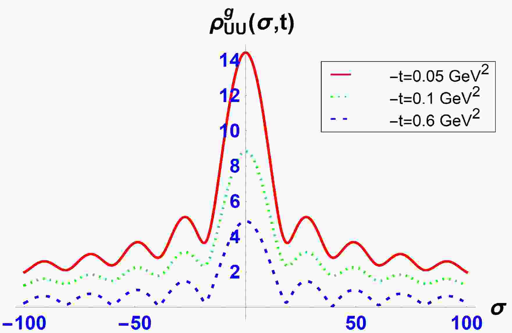 $ -t = 0.05 $ ,$ 0.1 $ , and$ 0.6\; \text{GeV}^2 $ , in order to study the impact of$ -t $ on the transversely polarized gluon Wigner distributions in σ space. For all cases, the transverse momentum transfer$ \Delta_\perp $ is chosen to be perpendicular to the gluon transverse momentum$ k_\perp $ , thereby suppressing contributions from terms proportional to$ k_\perp \cdot \Delta_\perp $ . The mass of the dressed quark is taken to be$ 0.0033\; \text{GeV} $ Figure 1 displays the Wigner distribution for an unpolarized gluon in an unpolarized target, presented in the longitudinal impact parameter space. Figure 2 shows the Wigner distributions in σ space for cases where the gluon, the target, or both are transversely polarized. In all the plots of Figs. 1 and 2, the gluon longitudinal momentum fraction is fixed at$ x_g = 0.7 $ , and the transverse momentum is chosen as$ k_\perp = 0.2\hat{x} $ GeV. Figure 2 illustrates the distortions in the gluon Wigner distributions induced by the transverse polarization of the gluon and the target state. Figs. 2(a) and 2(b) show the modification of the distribution when the gluon is transversely polarized in unpolarized and longitudinally polarized target. Figs. 2(c) and 2(d) show the plots when the target itself is transversely polarized. The magnitude of the gluon Wigner distributions is significantly reduced when the target is transversely polarized compared to the cases of longitudinal polarization or an unpolarized target. For the distributions$ \rho_{UT} $ and$ \rho_{LT} $ , the peak magnitude increases monotonically as$ -t $ decreases. In contrast, for$ \rho_{TT} $ and$ \rho_{TL} $ , the peak height exhibits a non-monotonic dependence on$ -t $ , reaching a maximum at$ -t = 0.1\; \text{GeV}^2 $ among the three chosen values of$ -t $ . A common feature across all the distributions is the emergence of a diffraction-like pattern in σ space. The results indicate that such diffraction-like patterns persist in the longitudinal impact parameter space even when either the gluon or the target is transversely polarized, with the peak of the distribution exhibiting sensitivity to the magnitude of$ -t $ . Similar diffraction patterns have also been reported in earlier studies for gluons in cases involving unpolarized and longitudinally polarized gluons and targets within the same model [28].