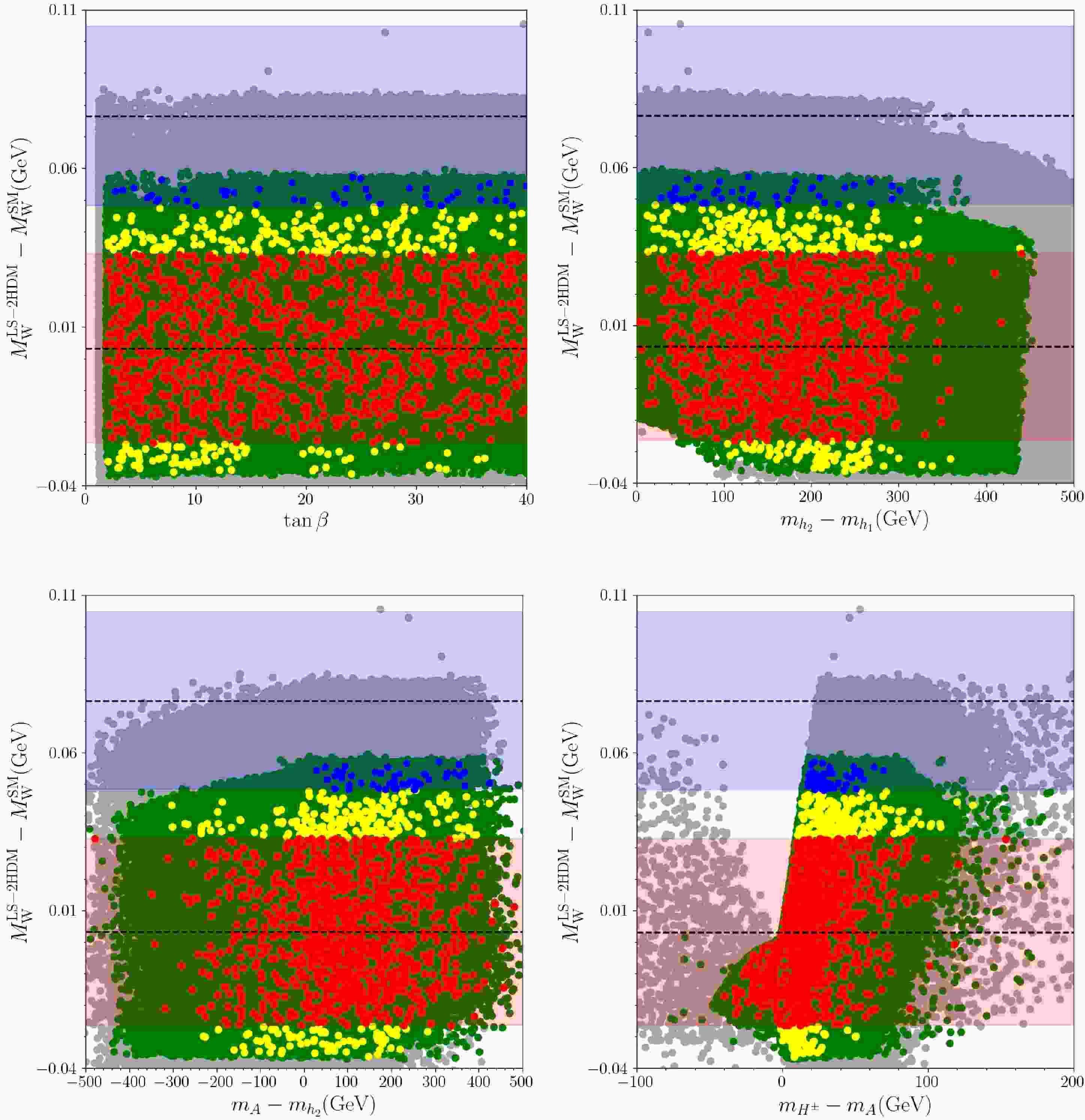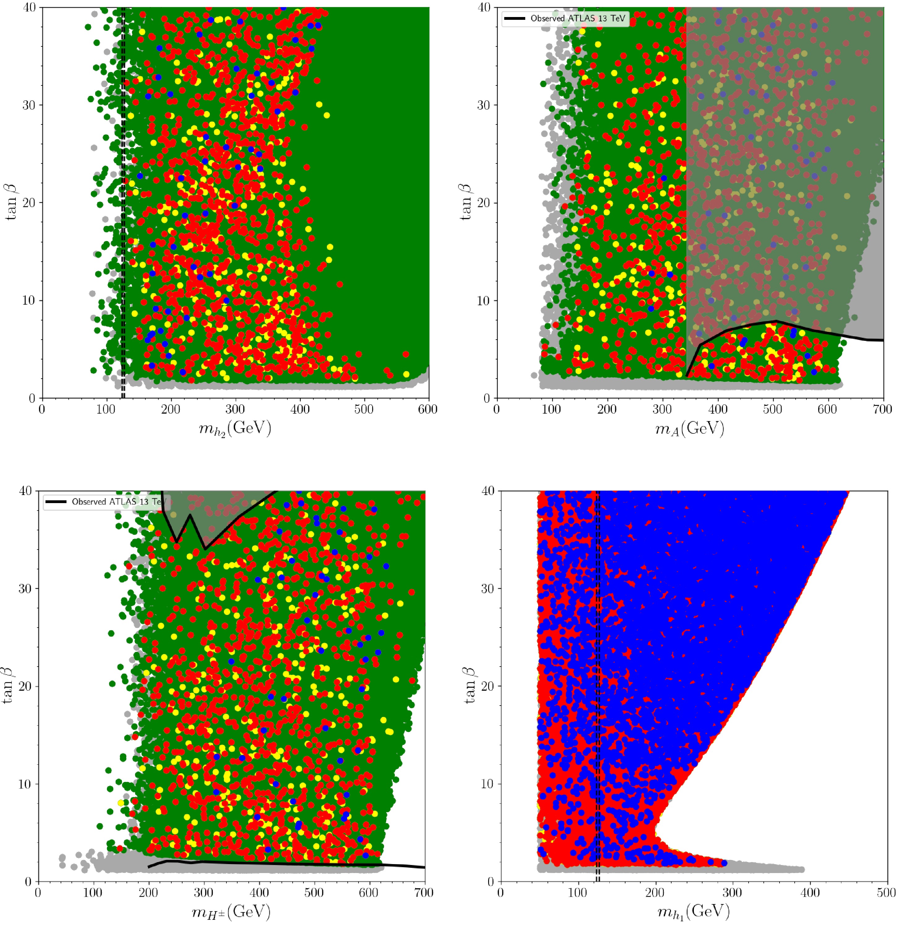 $ \tan\beta $ and the mass of the LS-2HDM scalars, for$ m_{h_2} $ (top-left),$ m_A $ (top-right),$ m_{H^\pm} $ (bottom-left) and$ m_{h_1} $ (bottom-right). Color coding of solutions are described in detail in previous text and summarized as: Green points satisfy conditions G1 and G2, yellow points satisfy conditions G1, G2 and G3, blue points satisfy conditions G1, G2, G3 and G4, red points satisfy conditions G1, G2, G3 and G5. Solid black lines indicate ATLAS 13 TeV analysis observation limits and gray shaded areas are excluded by these analysis [92, 93]. In$ \tan\beta $ vs$ m_{h_1} $ plot (bottom-right), condition G3 is not applied. Dashed vertical lines represent the SM-like Higgs mass.Additionally, the relationship between