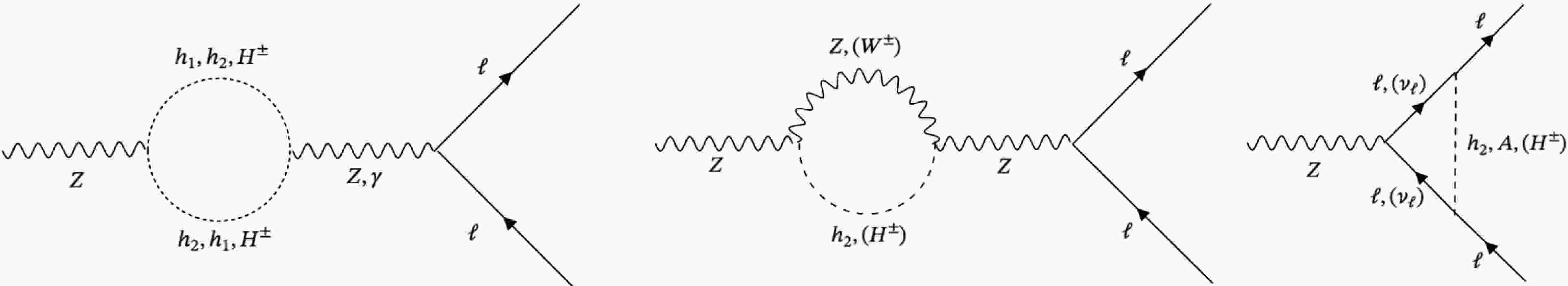 $ k=m_f^2 \tan^2\beta / 16\pi^2 v^2 $ ,$ m_f $ are fermion masses, Λ is the cut-off scale, μ is the renormalization scale, and$ r_\phi = m_\phi^2 / m_Z^2 $ ($ \phi = A, h_2, H^\pm $ ). The loop functions employed in Eqn. 17 are calculated as$ \begin{aligned}[b] B_Z(r)=\;& - \dfrac{1}{2}\left(\ln\Lambda^2 +\log(4\pi) \right)-\dfrac{1}{4} + \dfrac{1}{2}\log r ,\\ \tilde{C}_Z(r)=\;& - \dfrac{1}{2}\left(\ln\Lambda^2 +\log(4\pi) \right)-\dfrac{1}{2} -r \left(1+\log r \right)\\& +r^2\left(\log r \log(1+r^{-1}) - {\rm dilog}(-r^{-1}) \right) \\ &- \dfrac{i\pi}{2}\left(1-2r+2r^2\log\left(1+r^{-1}\right) \right) , \\ C_Z\left(r_1,r_2\right) =\;& C_Z(\dfrac{m_{\phi_1}^2}{m_{Z}^2},\dfrac{m_{\phi_2}^2}{m_{Z}^2}) = C_{00}(0,0,m_Z^2,m_{\phi_1}^2,m_{\phi_2}^2), \\ C_{00} =\;& \dfrac{1}{4}\left(\ln\Lambda^2 + \log(4\pi)-\ln(\dfrac{m_Z^2}{\mu^2})\right) \\&+ \dfrac{3}{8}-\dfrac{r_1^2\ln r_1}{4(r_1-1)(r_1-r_2)} + \dfrac{r_2^2\ln r_2}{4(r_2-1)(r_1-r_2)}. \end{aligned} $