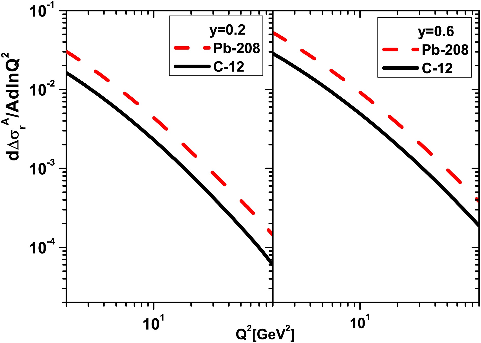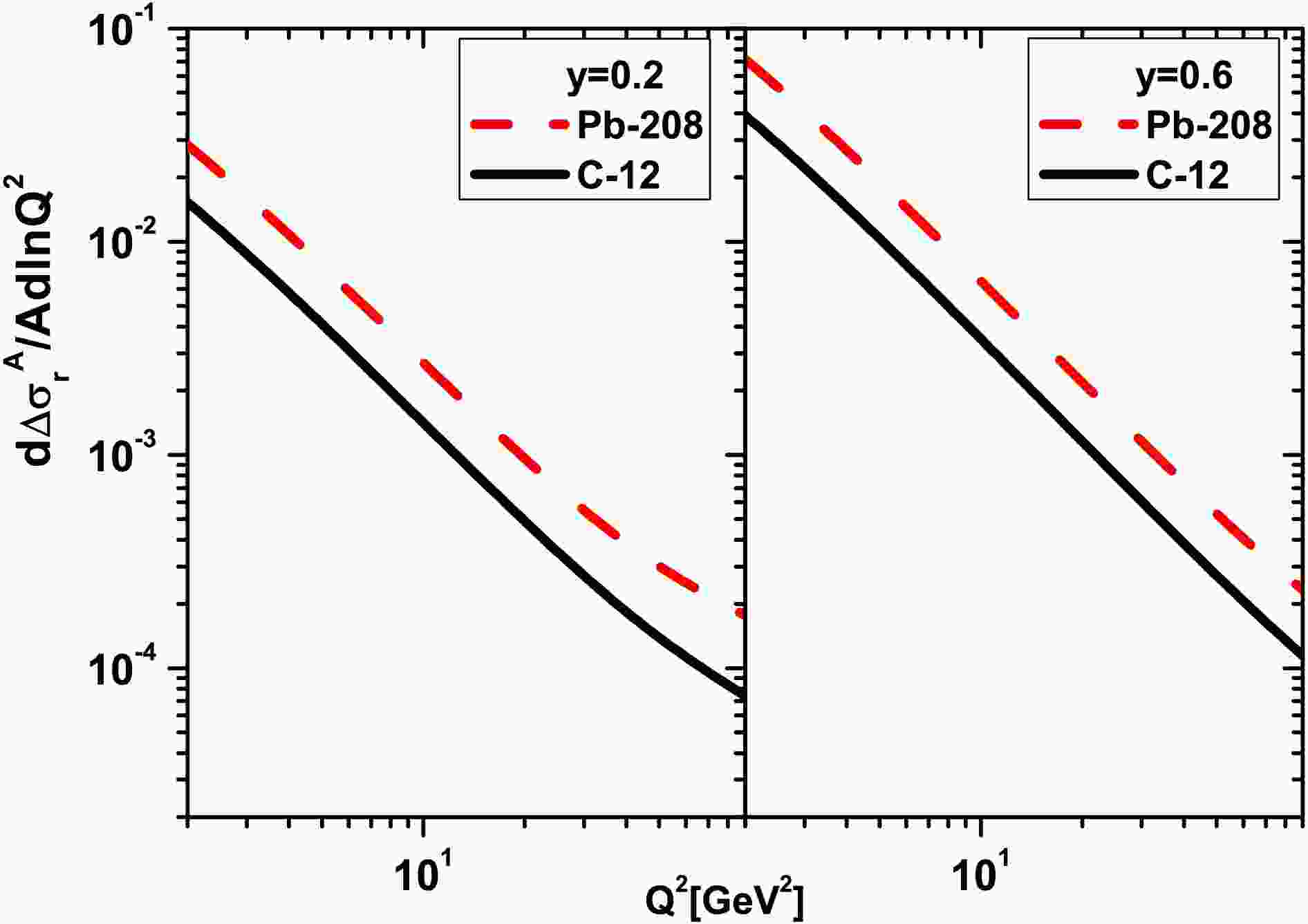 $ \frac{1}{A}\frac{{\partial}}{{\partial}{\ln}Q^2}\Delta\sigma_{r}^A(x,Q^2) $ are shown as a function of$ Q^2 $ at$ y=0.2 $ (left) and$ y=0.6 $ (right) for the light nucleus of C-12 (black-solid curve) and the heavy nucleus of Pb-208 (red-dashed curve) due to the DL method [32].