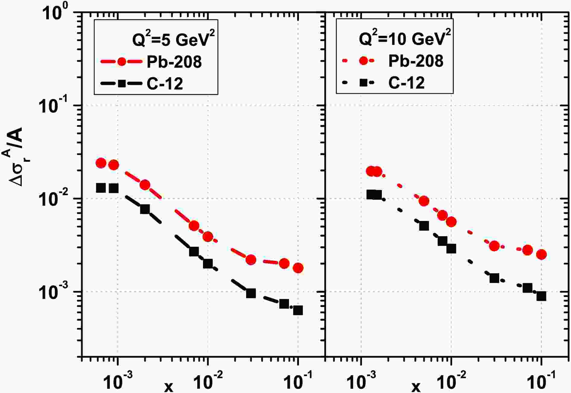 $ \frac{1}{A}\Delta\sigma_{r}^A(x,Q^2) $ are shown as a function of$ Q^2 $ at$ Q^2=5\; {\rm{GeV}}^2 $ (left) and$ Q^2=5\; {\rm{GeV}}^2 $ (right) for the light nucleus of C-12 (black-square points) and the heavy nucleus of Pb-208 (red-circle points) due to the DL method [32].