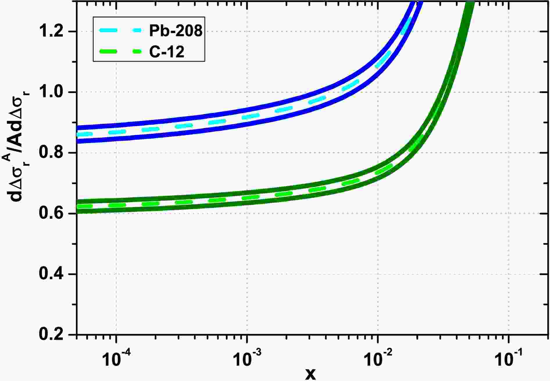 $ \frac{{\partial}{\Delta}\sigma_{r}^{A}(x,Q^2)}{A{\partial}{\Delta}\sigma_{r}(x,Q^2)}|_{y=cte}{\simeq} \frac{\partial{\Delta}F_{2}^{A}(x,Q^2)}{A\partial{\Delta}F_{2}(x,Q^2)}= $ $ A(R_{g}^{A})^2\frac{{\pi}{\cal{R}}^{2}_{p}}{{\pi}{\cal{R}}_{A}^2} $ as a function of Bjorken-x for the light nucleus of C-12 (green curves) and the heavy nucleus Pb-208 (blue curves) with$ {\pi}{\cal{R}}^{2}_{p}=1.55{\pm}0.02\; {\rm{fm}}^2 $ and$ {\cal{R}}_{A}=1.12A^{1/3}- $ $ 0.86A^{-1/3}\; {\rm{fm}} $ .$ R_{g}^{A} $ is predicted by the HIJING parameterization.For comparison with the nCTEQ15 nPDFs [45] results, we calculate the expression