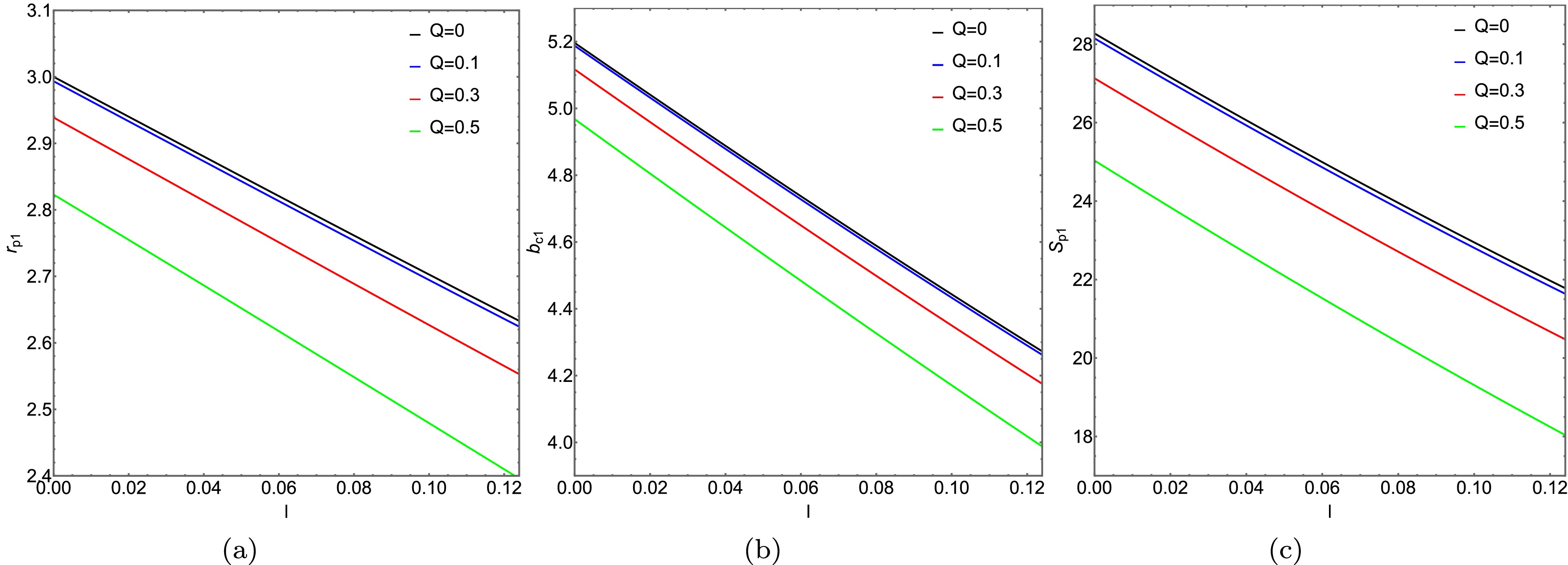 $ M_1 $ , panels (a), (b), and (c) respectively depict the variation of the photon sphere radius$ r_{p_{1}} $ , impact parameter$ b_{c_{1}} $ , and enclosed area$ S_{p_{1}} $ of the photon sphere with the Lorentz-violation parameter l.