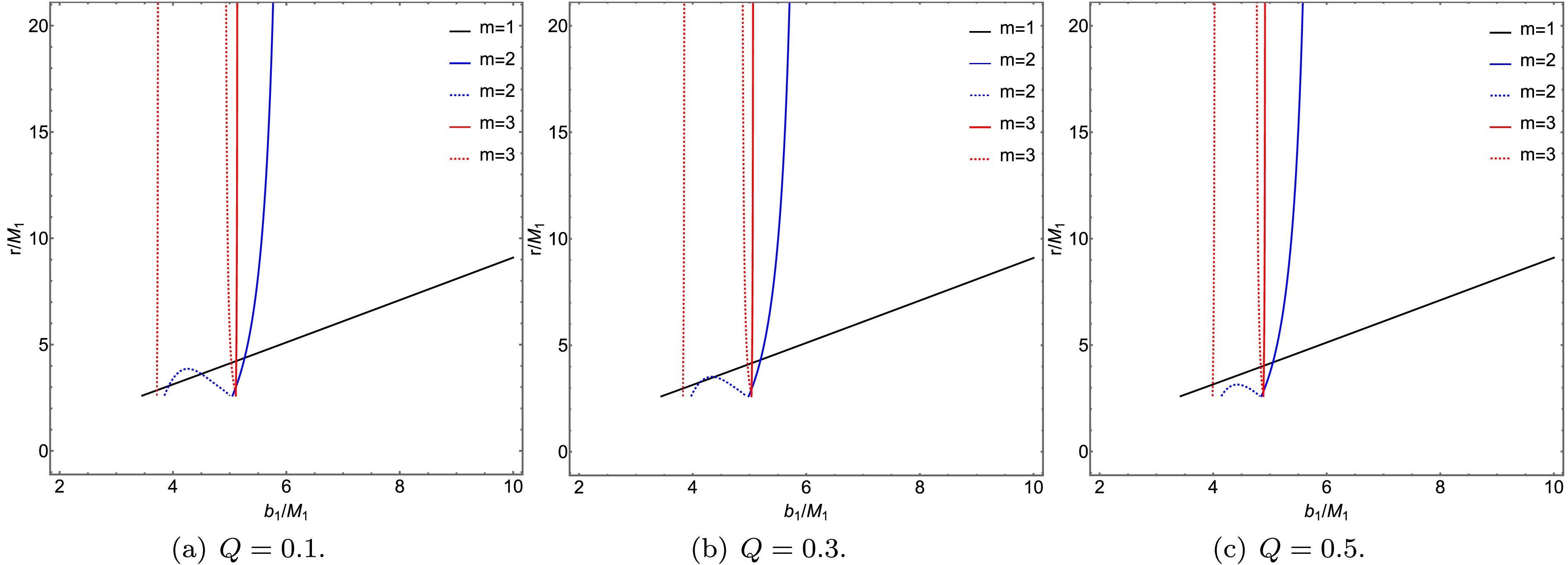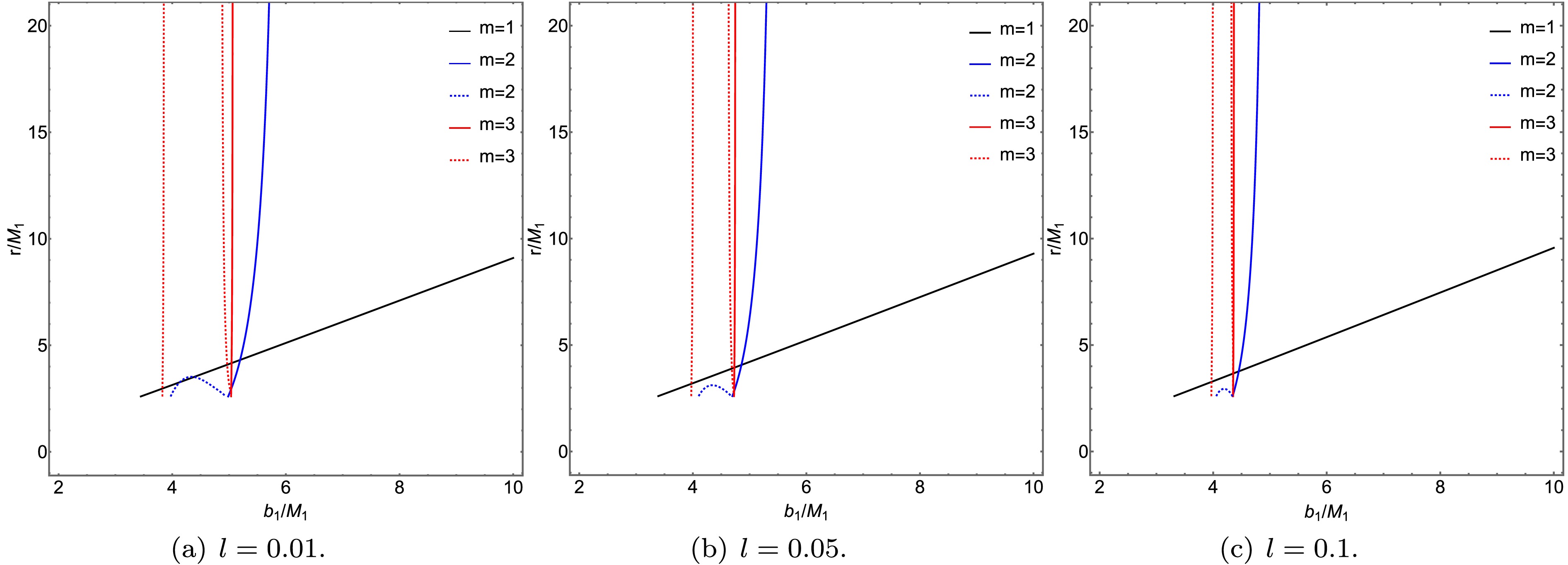 (32) $ r_m\left(b_1\right) $ represents the transfer function, and$ b_1 $ denotes the impact parameter. The radial coordinate of the intersection point between the thin accretion disk and photon trajectory is determined by the transfer function$ r_m\left(b_1\right) $ . When$ m=1 $ ,$ m=2 $ , and$ m=3 $ , they correspond to the direct emission, lensing ring, and photon ring of the thin accretion disk, respectively. The relationship between the transfer function and impact parameter is illustrated in Figs. 9 and 10, where we have considered the effects of varying charge and Lorentz -violation parameters.