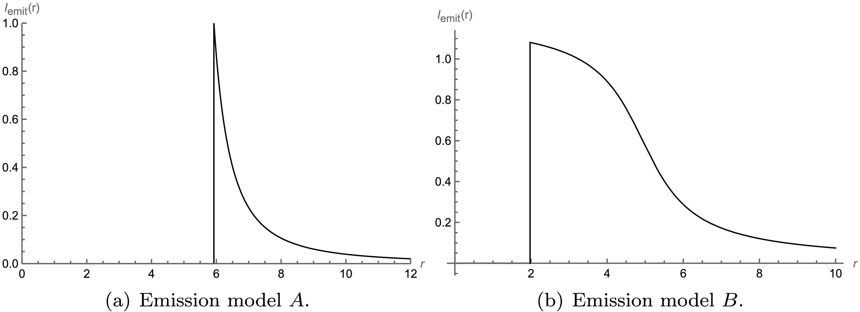 $ \begin{aligned} I_A^{{\rm{em}}}(r)= \begin{cases}0 & r<r_{\rm isco}, \\ \left(\dfrac{1}{r-\left(r_{\rm isco}-1\right)}\right)^2 & r \geq r_{\rm isco}.\end{cases} \end{aligned} $