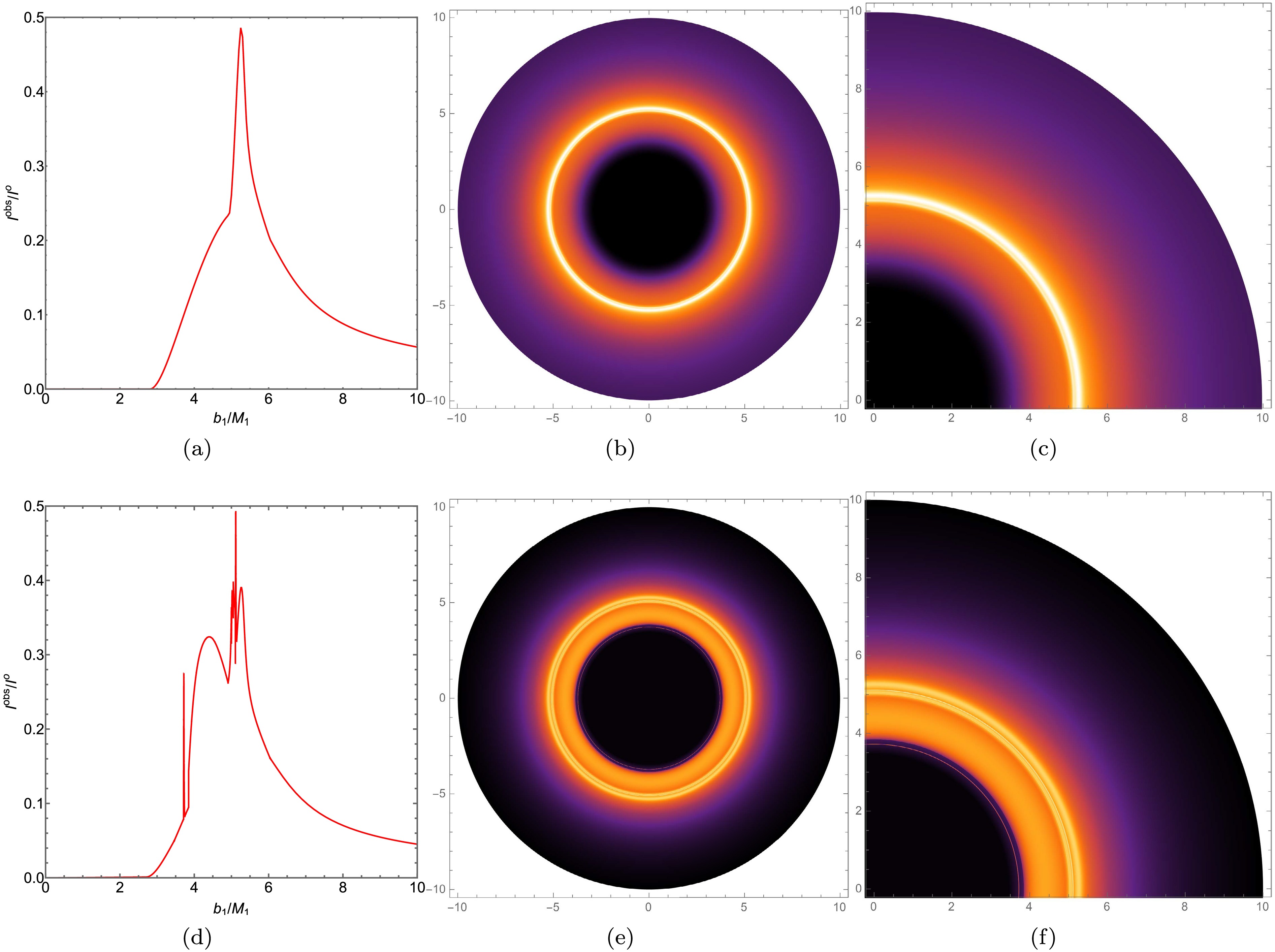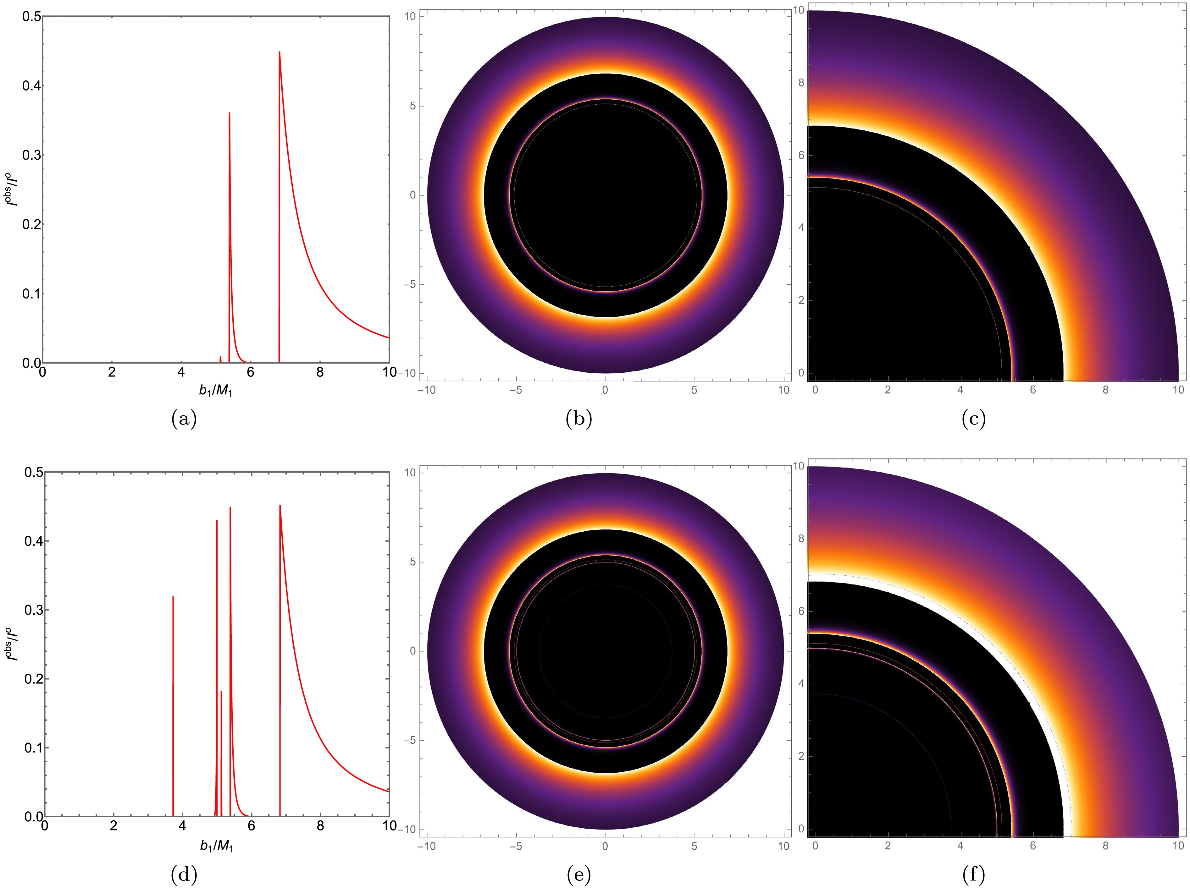 $ r=r_{\rm isco} $ and then decreases with radius, asymptotically approaching zero. For an observer at infinity, the effective radiation originating from within the photon unstable orbit is negligible, as any emission from this region is either highly redshifted or captured by the central object. We plot the radiation function in Fig. 11 (a). Additionally, we show the optical appearance of black holes with the same mass parameter and radiation model A in the first row of Fig. 12. For better comparison, we computed the observed intensity and constructed the corresponding intensity distribution and local intensity maps for the ATSW using Model A through our ray-tracing method. The results are shown in the second row of Fig. 12. By comparing Figs. 12 (a) and 12 (b), it is evident that the BH and ATSW exhibit significant differences in their optical structures, with distinct spatial separations between the direct radiation, lens, and photon rings. Observing Fig. 12 (a), we find that the observational intensity of ATSW appears at the critical curve$ b_1 \simeq 6.8289 M_1 $ , with an intensity of 0.4529, which subsequently decreases to zero. The lens ring is located within a narrow region between the critical curves$ b_1 \simeq 5.3774 M_1 $ and$ b_1 \simeq 5.8891 M_1 $ . The photon rings appear near the critical curves at$ b_1 \simeq 3.7221 M_1 $ ,$ b_1 \simeq 4.9676 M_1 $ , and$ b_1 \simeq 5.1213 M_1 $ . Compared to BH, intriguingly, two new photon rings emerge in the shadow of the ATSW, located near the critical curves at$ b_1 \simeq 3.7221 M_1 $ and$ b_1 \simeq 4.9676 M_1 $ , as shown in Figs. 12 (a) and 12 (d). By examining Figs. 12 (b) and 12 (c), we observe that the direct emission ring is near the edge of the black disk, while the lens ring is positioned inside the black disk. Furthermore, Figs. 12 (e) and 12 (f) reveal that the additional photon rings of the ATSW are closer to the black disk.