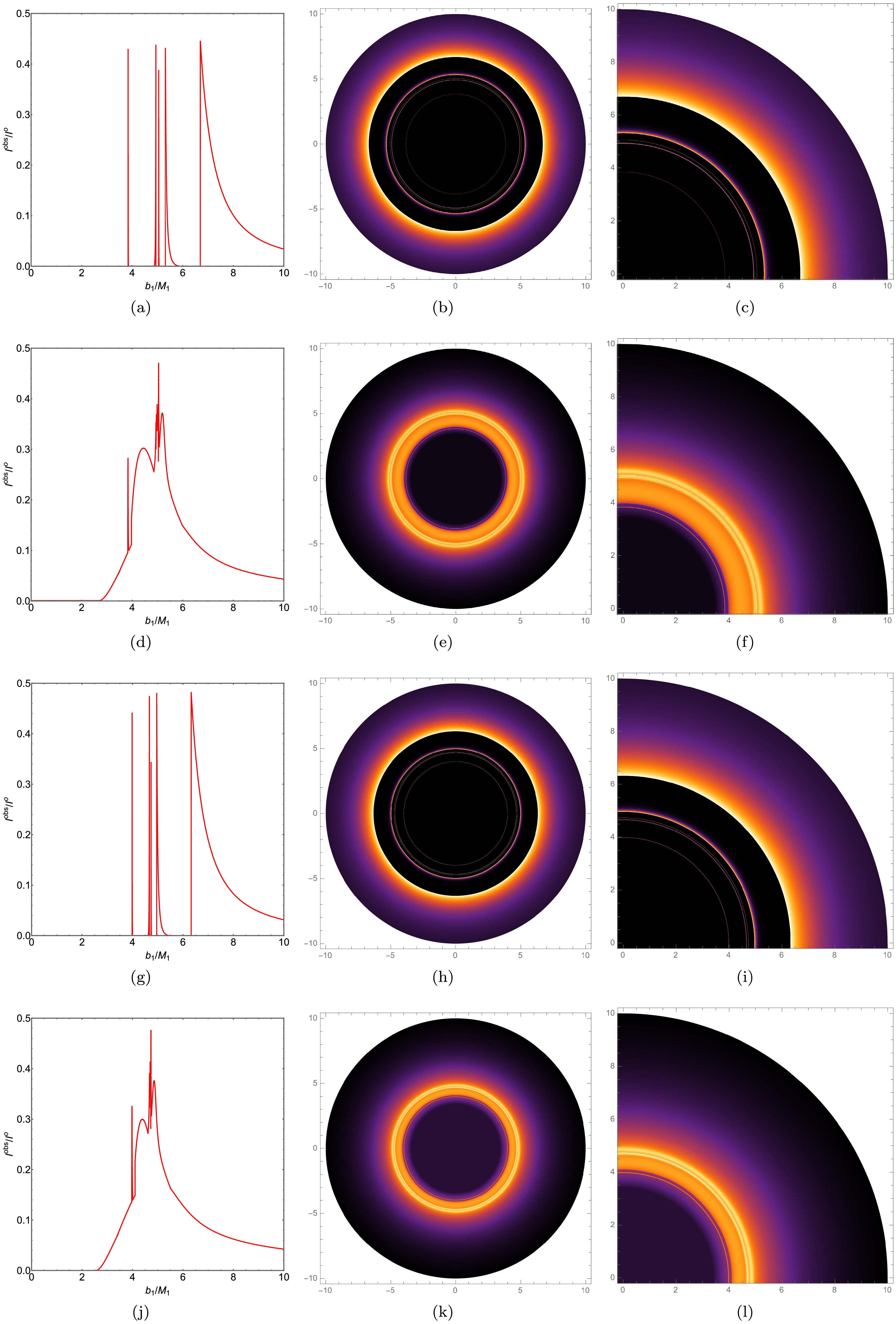 $ Q=0.3 $ ,$ l=0.01 $ and$ Q=0.3 $ ,$ l=0.05 $ for two radiation models, as shown in Fig. 14. Observing Figs. 12, 13, and 14 , we find that in radiation model A, for the case of$ Q=0.3 $ ,$ l=0.01 $ , the two additional photon rings are located at$ b_1 \simeq 3.8425 M_1 $ and$ b_1 \simeq 4.0561 M_1 $ , respectively; for$ Q=0.3 $ ,$ l=0.05 $ , the two additional photon rings are located at$ b_1 \simeq .9942 M_1 $ and$ b_1 \simeq 4.7456 M_1 $ , respectively. In radiation model B, for$ Q=0.3 $ ,$ l=0.01 $ , the additional lensing ring is located between$ b_1 \simeq 3.8221 M_1 $ and$ b_1 \simeq 5.056 M_1 $ ; for$ Q=0.3 $ ,$ l=0.05 $ , the additional lensing ring is located between$ b_1 \simeq 3.9686 M_1 $ and$ b_1 \simeq 5.0764 M_1 $ . The results indicate that as the charge Q and Lorentz-violation parameter l increase, the range of light bands outside the shadow decreases, but the range of specific additional rings increases. Therefore, the trend of change in the external shadow region is the same as that of the KR field BH, while the trend of change in specific additional rings is opposite.