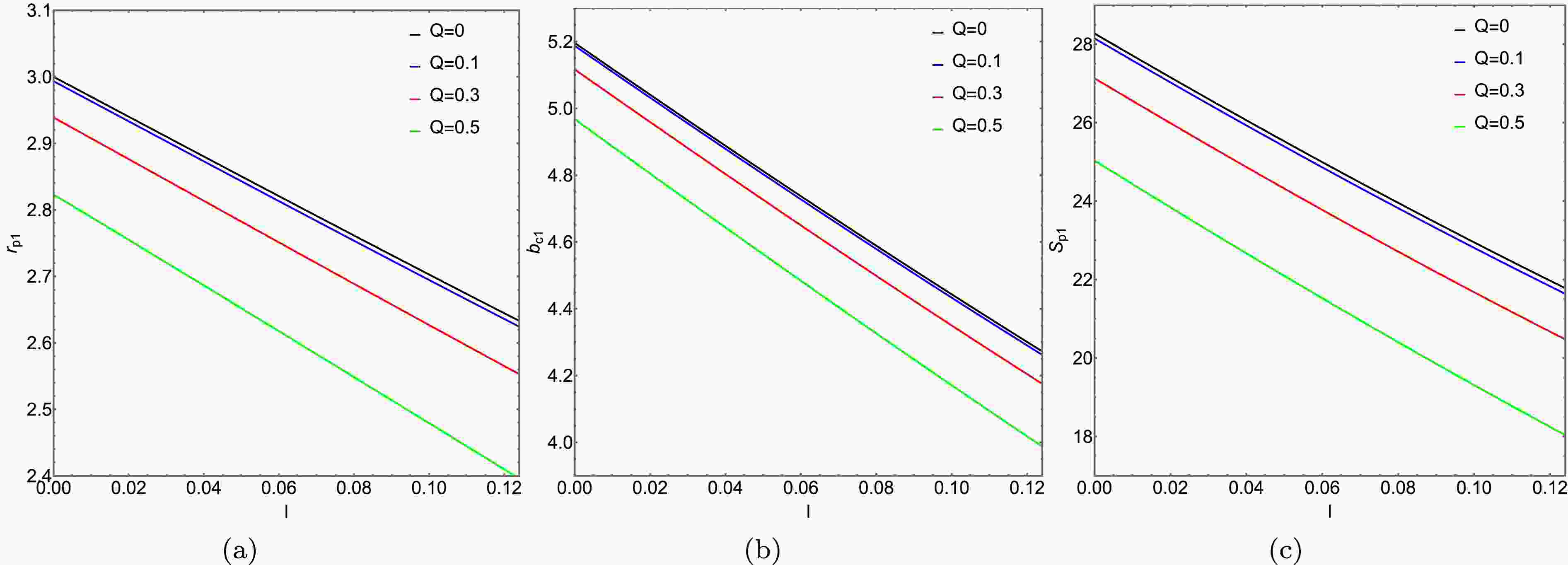 $ Q=0.3 $ ) in Figs. 3 (a) and 4 (a), we discern three distinct photon trajectories, as illustrated in the diagram on the lower right side. For the scenario where$ l=0.01 $ and$ Q=0.1 $ , as shown by the black line in Fig. 3, when$ b_1>b_{c_1}=5.11841 $ , the gravitational influence results in the deflection of the photon trajectory. When$ b_1=b_{c_1} $ , the photon will perpetually orbit around the BH in a circular path. When$ b_1<b_{c_1} $ , due to the intense gravitational force, the photon will directly plunge into the BH. Furthermore, it is noted that with increasing charge Q and Lorentz-violation parameter l, the effective potential energy of the BH also rises, and the position corresponding to the peak shifts inward.