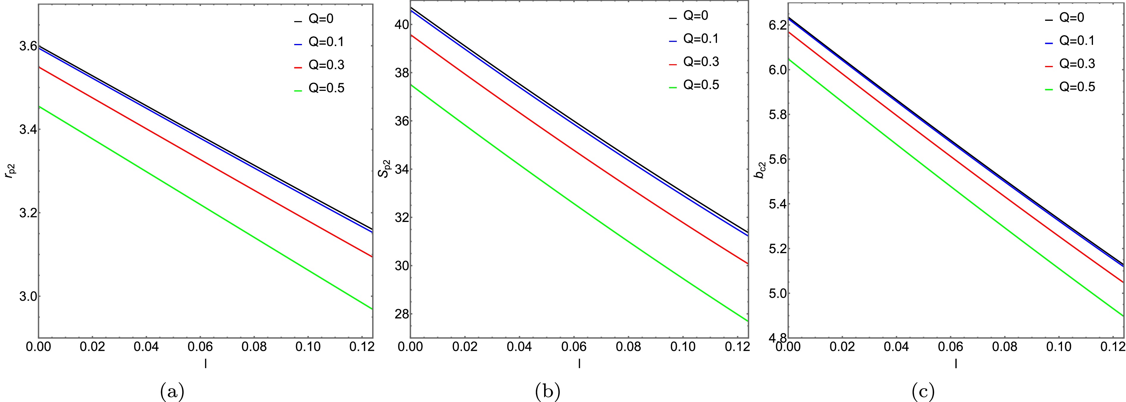 $ r_{p h_i} $ and the critical collision parameter$ b_{c_i} $ , calculations were conducted using the formula for the photon sphere radius with$ M_1=1 $ and$ M_2=1.2 $ . The results are shown in Table 1 and 2. And the variations of the photon sphere radius and its corresponding area with respect to the charge Q and the Lorentz-violation parameter l are plotted in Figs. 1 and 2. Based on the relevant research, the charge Q is limited to the range from 0 to 0.5, and the Lorentz-violation parameter l is limited to the range from 0 to 0.1. It was observed that when$ Q=0 $ and$ l=0 $ , the scenario corresponds to the Schwarzschild ATSW, and when$ l=0 $ , it corresponds to the Reissner-Nordström case. From Figs. 1, 2 and Table 1, 2, it is observed that the impact parameter$ b_{c_{i}} $ , photon sphere radius$ r_{p_{i}} $ , and the corresponding enclosed area$ S_{p_{i}} $ decrease with increasing charge Q and Lorentz-violation parameter l.Q 0 0.1 0.3 0.5 $ b_{c_{1}} $ 2.97 2.96319 2.90474 2.78891 $ r_{p_{1}} $ 5.11841 5.1096 5.0378 4.8863 $ b_{c_{2}} $ 3.564 3.55833 3.51224 3.41614 $ r_{p_{2}} $ 6.1421 6.13476 6.07531 5.95206 Table 1. The variation of photon sphere radius