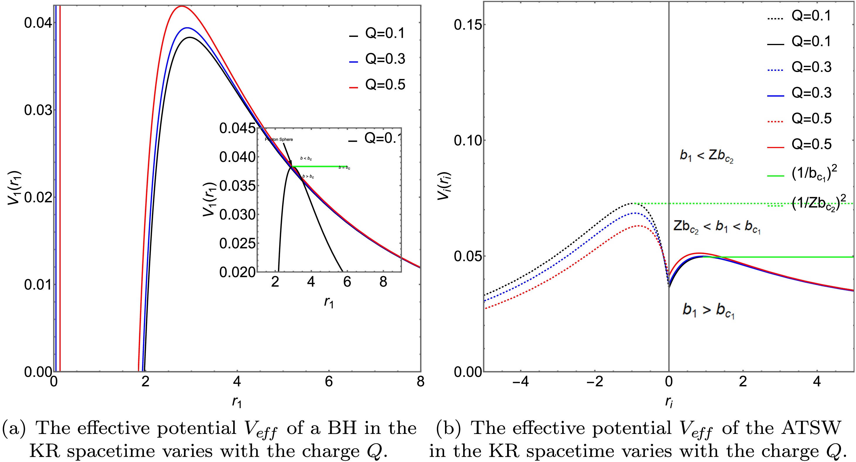 $ l=0.01 $ , we analyze the effective potentials of the BH and ATSW in the KR field as functions of Q. The left plot shows the effective potential for BH, while the right plot displays that for ATSW. Various Q values are considered, specifically, Q = 0, 0.1, 0.3, 0.5. In the right plot, the solid and dashed lines correspond to the effective potentials for$ M_1 $ and$ M_2 $ , respectively, with parameters set as$ M_1=1 $ ,$ M_2=1.2 $ , and$ R=2.6 $ .