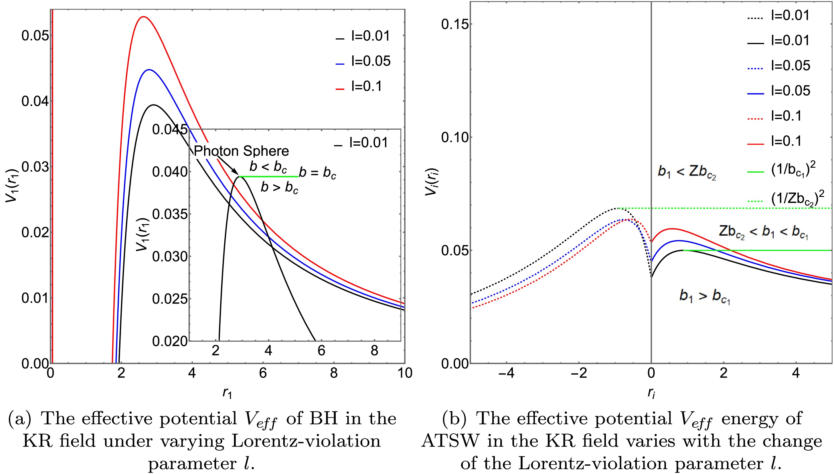 $ M_2 $ , panels (a), (b), and (c) respectively depict the variation of the photon sphere radius$ r_{p_{2}} $ , impact parameter$ b_{c_{2}} $ , and area$ S_{p_{2}} $ enclosed by the photon sphere with Lorentz-violation parameter l.The effective potential energies of BH and ATSW in the KR field are depicted in Figs. 3 and 4, respectively. By examining the effective potential energy of BH (with charge